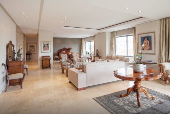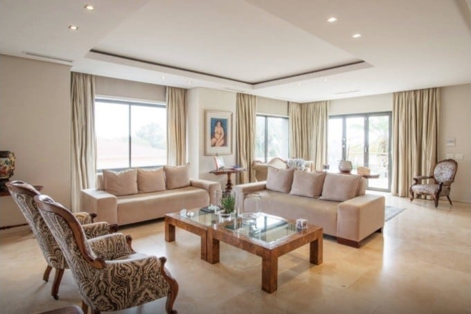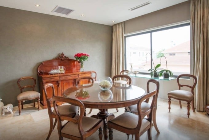 The main lounge is situated adjacent to the open plan dining room and overlooks the swimming pool, complete with sun lounges and outdoor dining facilities. The fully equipped kitchen is a chef’s dream, offering ample room with built in cupboards and all of the necessary appliances.