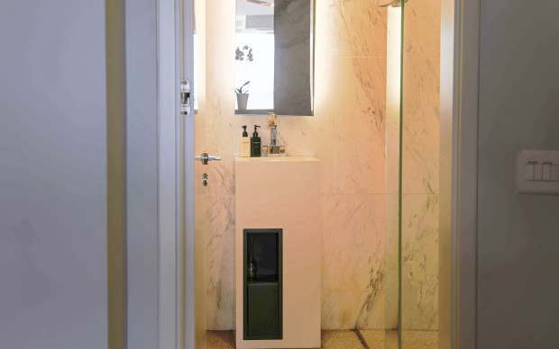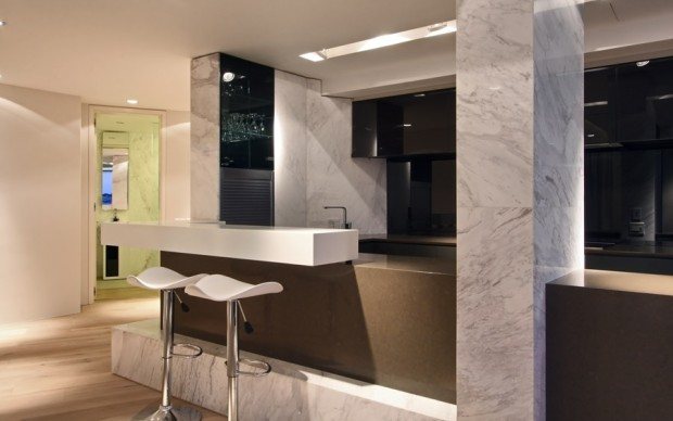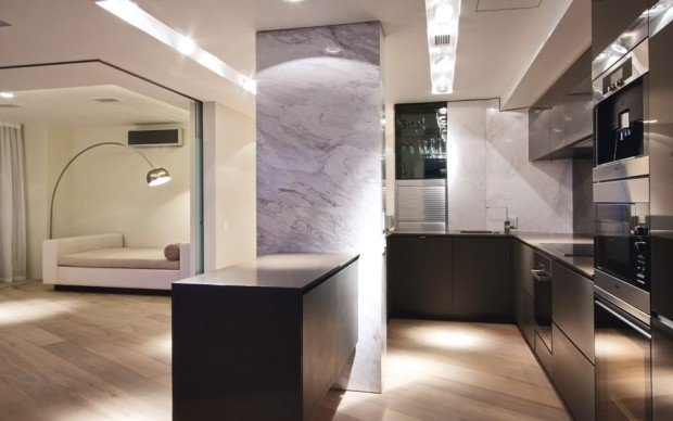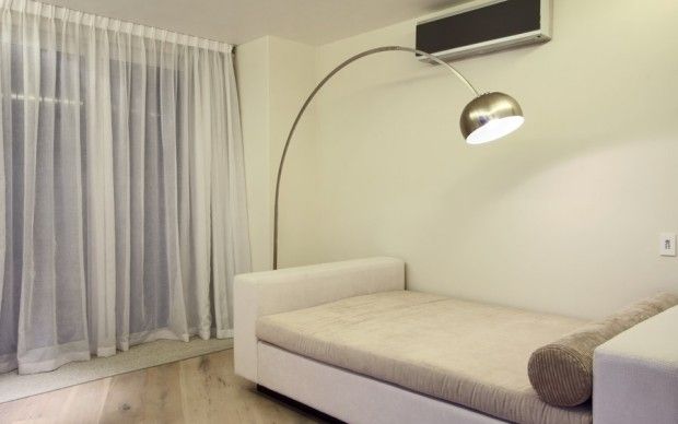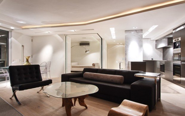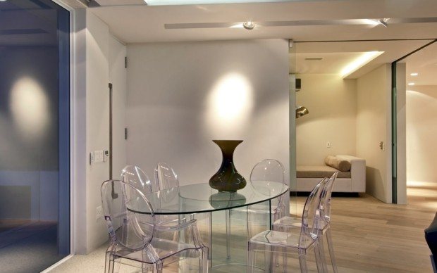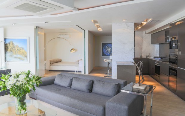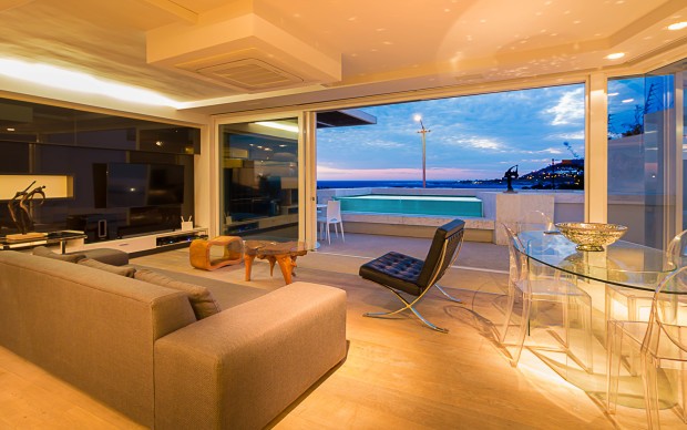 The lounge is open plan and leads onto a terrace with a great view. There are large glass doors that can slide open to make the living area into an outdoor space.