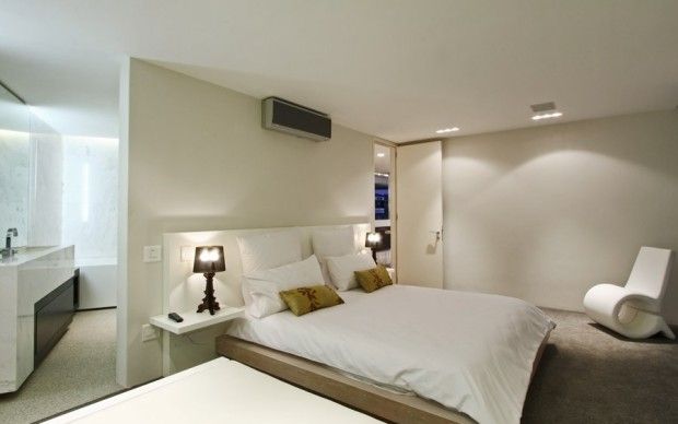 The en suite bathroom has a double basin, bath, shower, and private toilet.