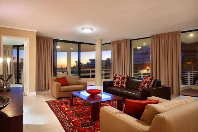 The extraordinary Blue Waters Apartment building is surrounded by electric fencing and high security gates, with two bays of undercover secure parking and friendly reception to greet you when entering the lush greenery of the hallways. You will see that your safety is always guaranteed. Entering the spacious living area that’s almost fully surrounded by glass doors walking out on the massive wrap-around balcony the view of Table Mountain and Robben Island will let you see what makes Cape Town so special.