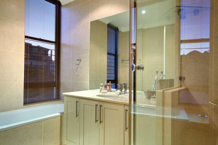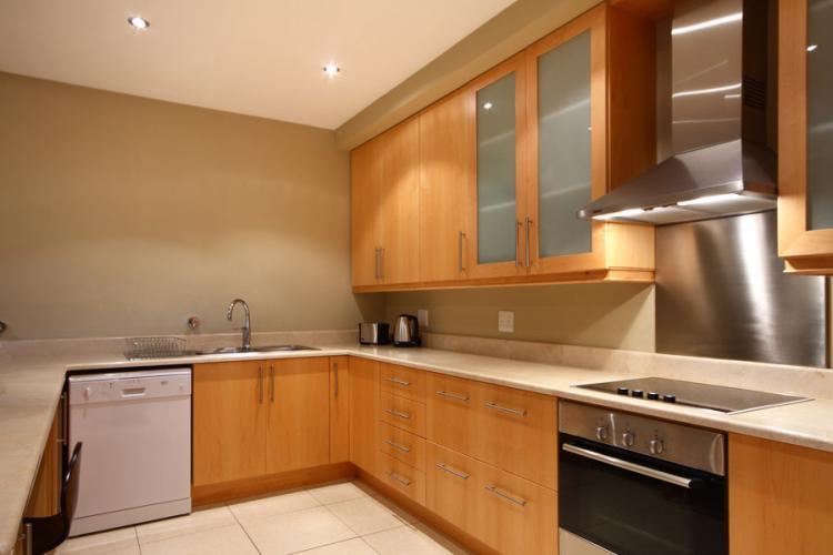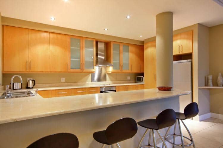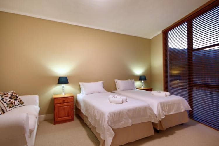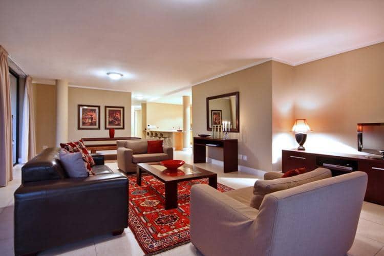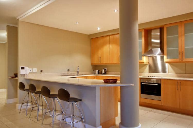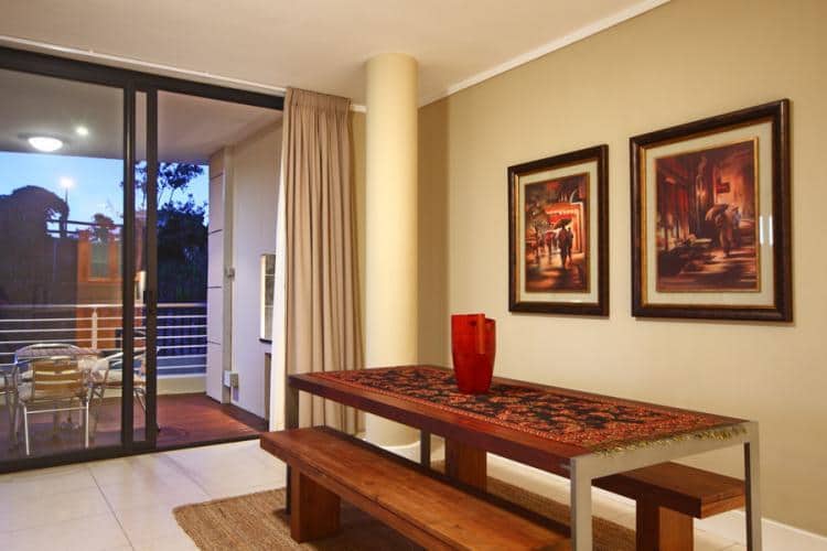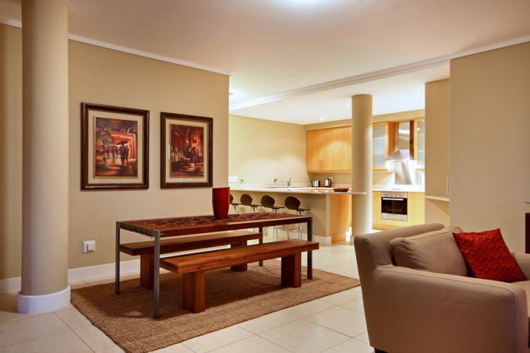 An open plan and minimalistic design gives a feeling of sophistication that the discerning mature guest will appreciate. The dark wood features blends very well with the kudu leather couch where reading a book or just relaxing while watching the 32inch flat screen TV is possible. An 8-seater dining room makes entertaining a pleasure even if is around the 4-seater kitchen counter.