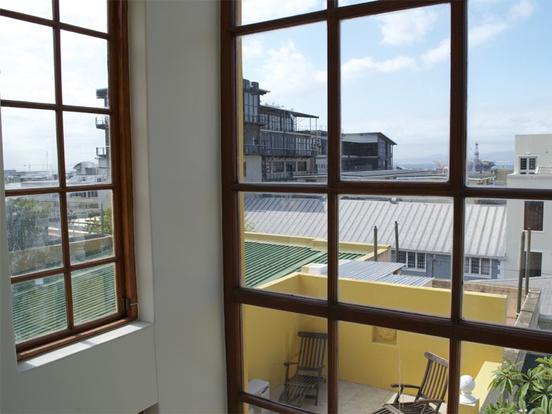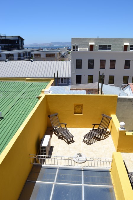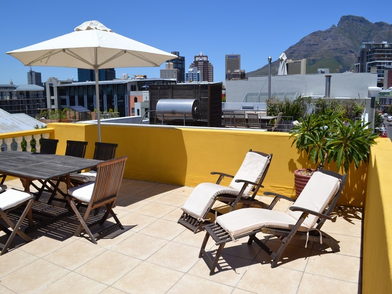 The stairs continue up to the large roof deck with large seating area, further sun loungers and amazing views of Table Mountain and the City.