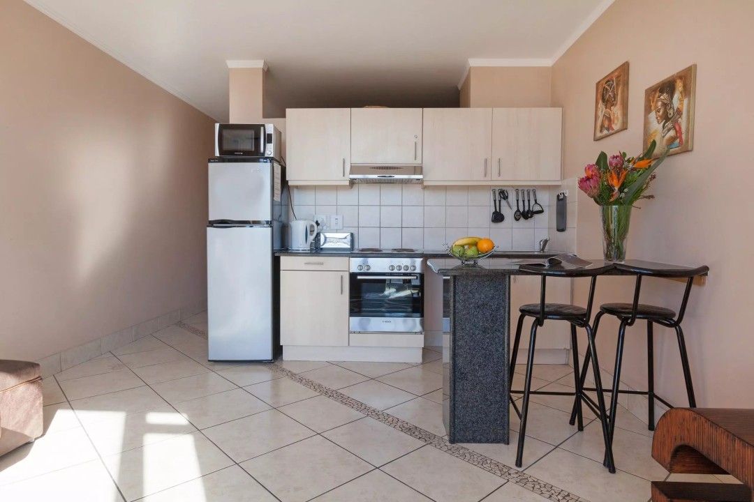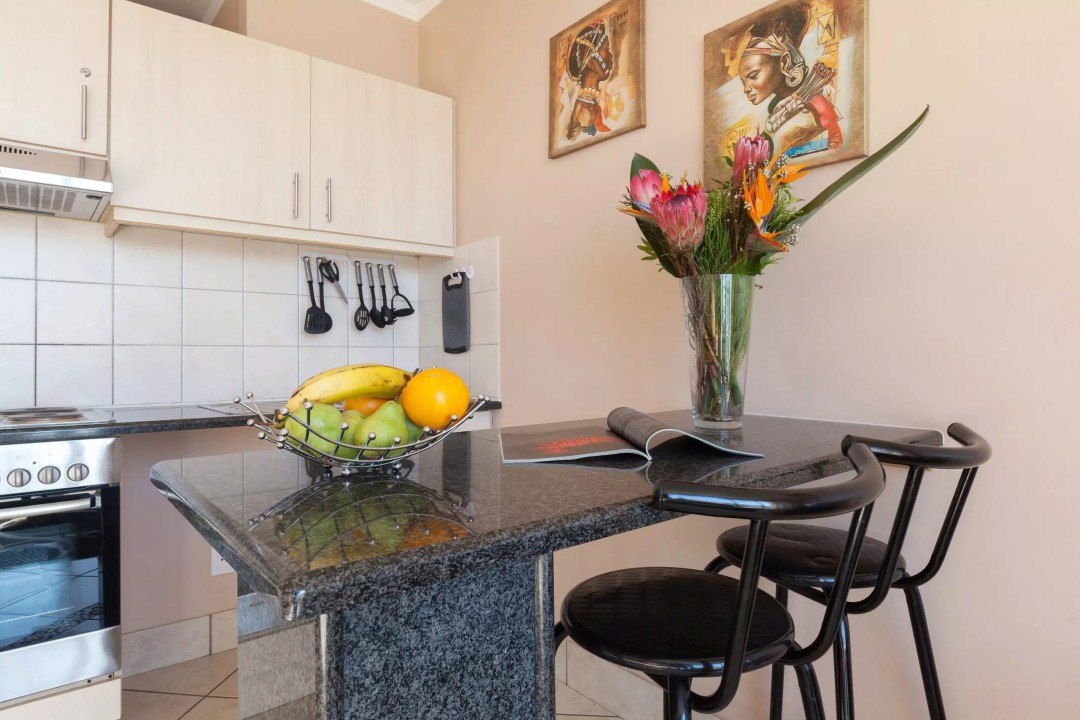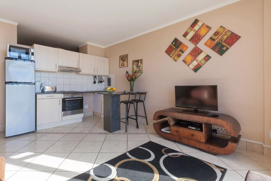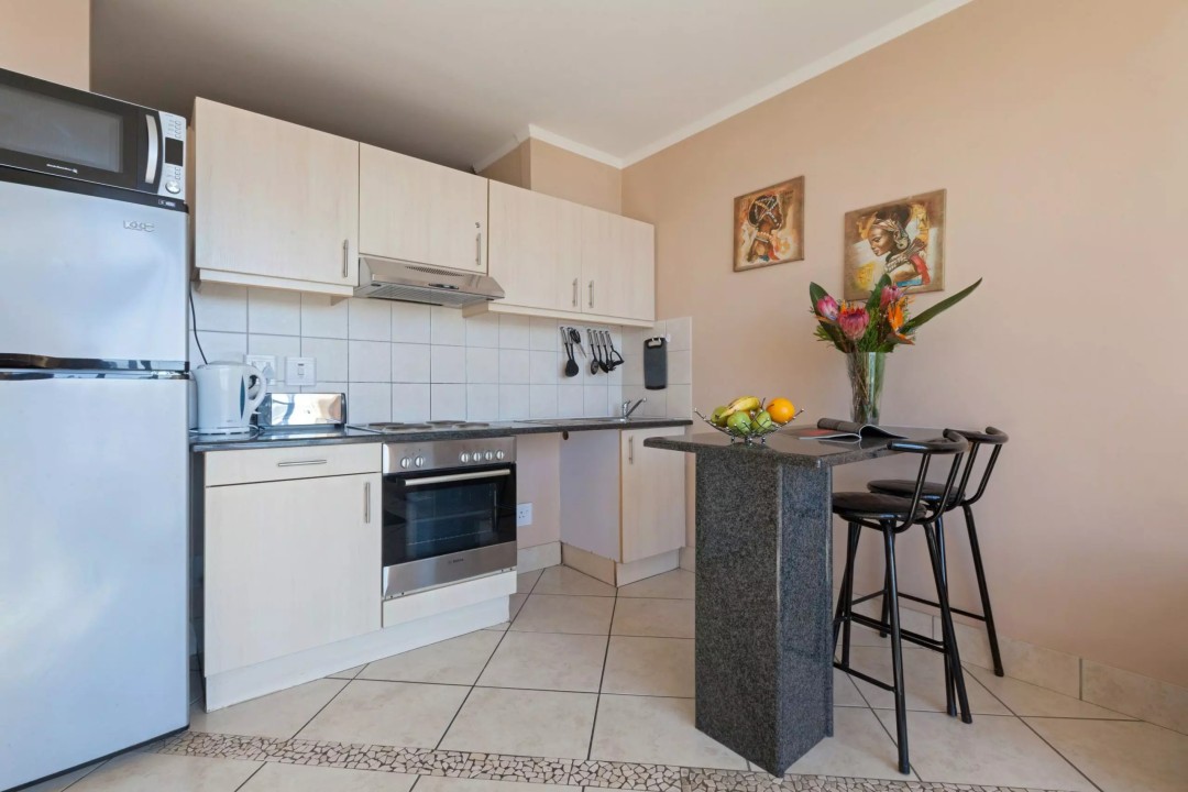 Going down the corridor you go into the open-plan kitchen living room. The one that is on cooking duty won’t need to feel alone being it an open planned area they can also enjoy the company of the rest of the family. Having the kitchen island provides the cook to still have some form of privacy unless there is one that would like to join in a conversation about the day’s happenings there is bar stools. The open-plan kitchen and living area are also decorated with warm and natural colors with African Traditional paintings, it tweaks those that love our vast variety of cultures in Africa and in the Mother City. The kitchen is equipped especially for those that enjoy cooking but still enjoy the love of take-out, can’t be in the central city and not go out and explore the different tastes that are on offer.