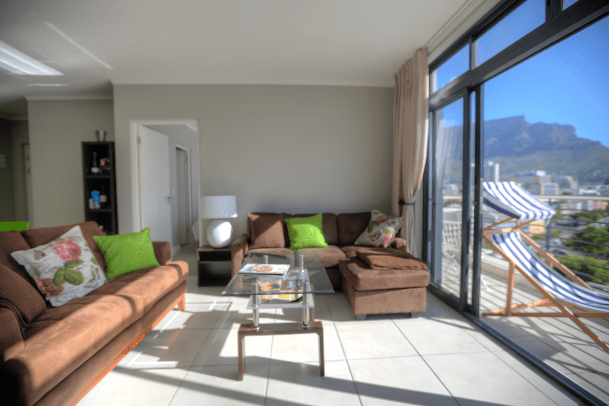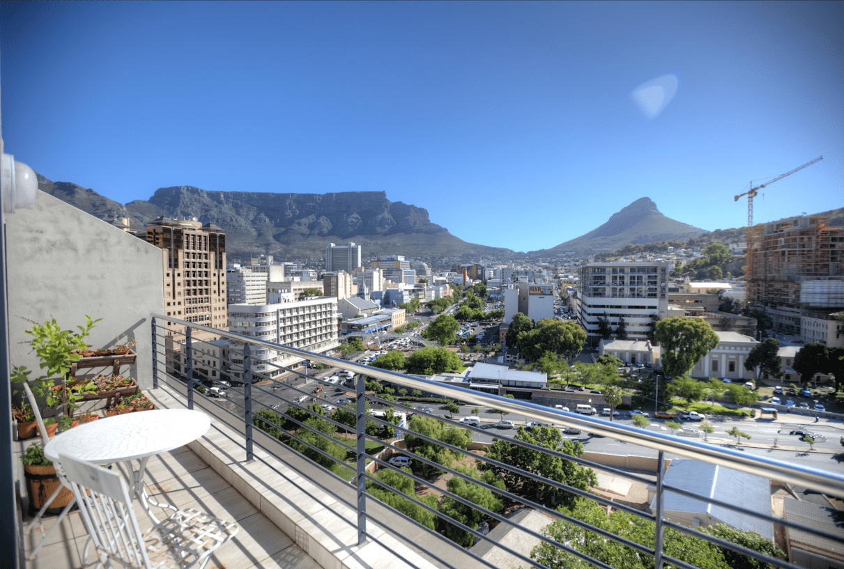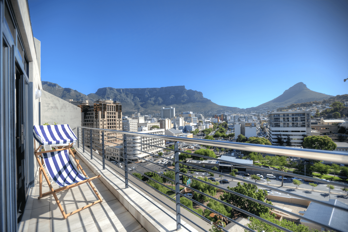 The long balcony, which is the length of the the apartment, is accessible from all of the rooms. Outside furniture directly facing table mountain and a gas Weber barbeque make this space a perfect sport to relax on a summer evening.