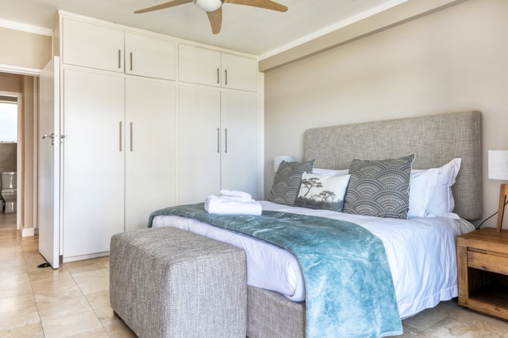 Beautifully decorated in rich earthy tones, the master bedroom is sunny and bright with a double bed and an en-suite bathroom with a large shower. This spacious room has ample cupboard space, and a ceiling fan, and opens onto the balcony with lovely views of the sea.