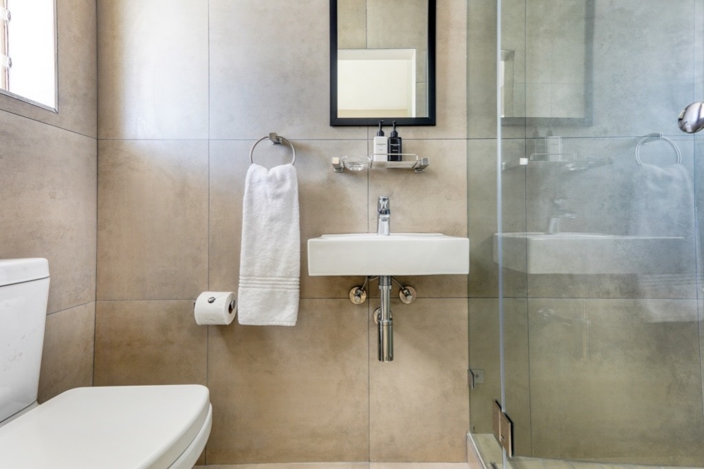 The second bedroom has a double bed, a ceiling fan, and a separate bathroom with a shower. A washing machine and a tumble dryer can be found in this bathroom tucked neatly away beneath the basin. The third bedroom has a double bed, a standing fan, and an en-suite bathroom with a shower.