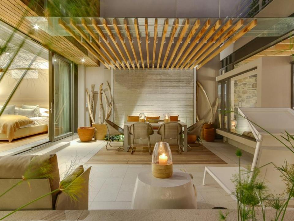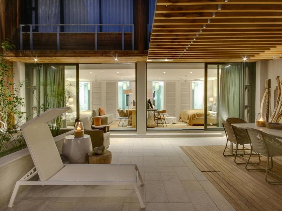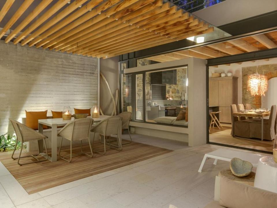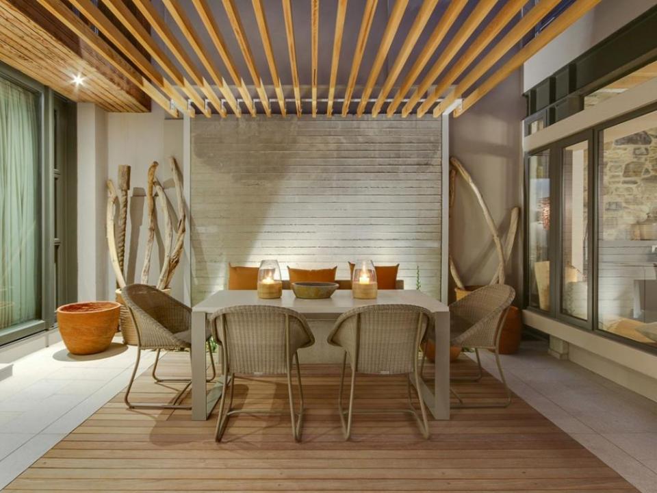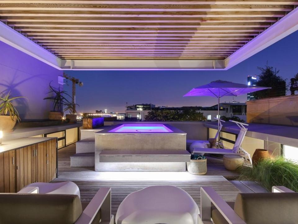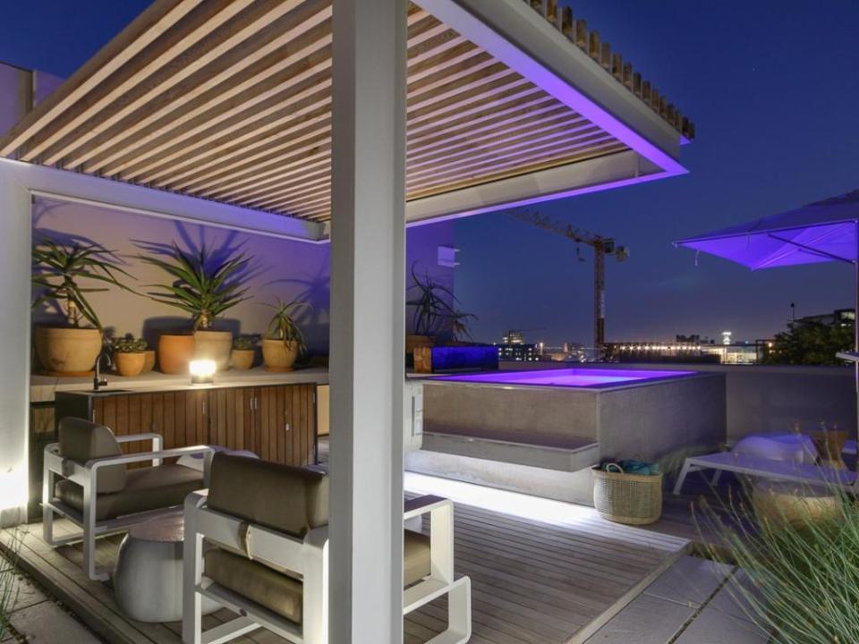 In the courtyard you will find outdoor dining for 7 and a sun lounger. Stairs lead up to the rooftop pool deck with a splash pool, and comfortable outdoor furniture.