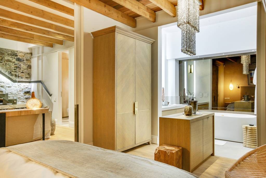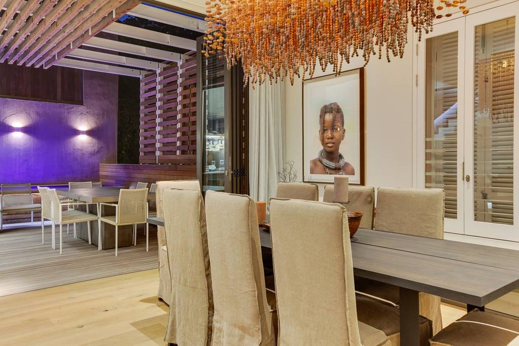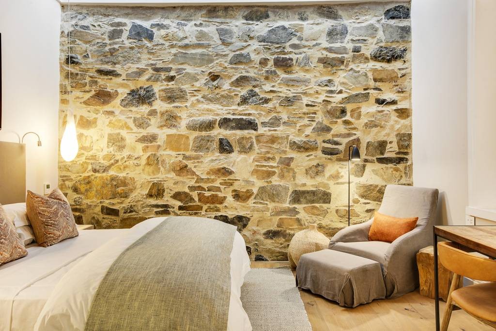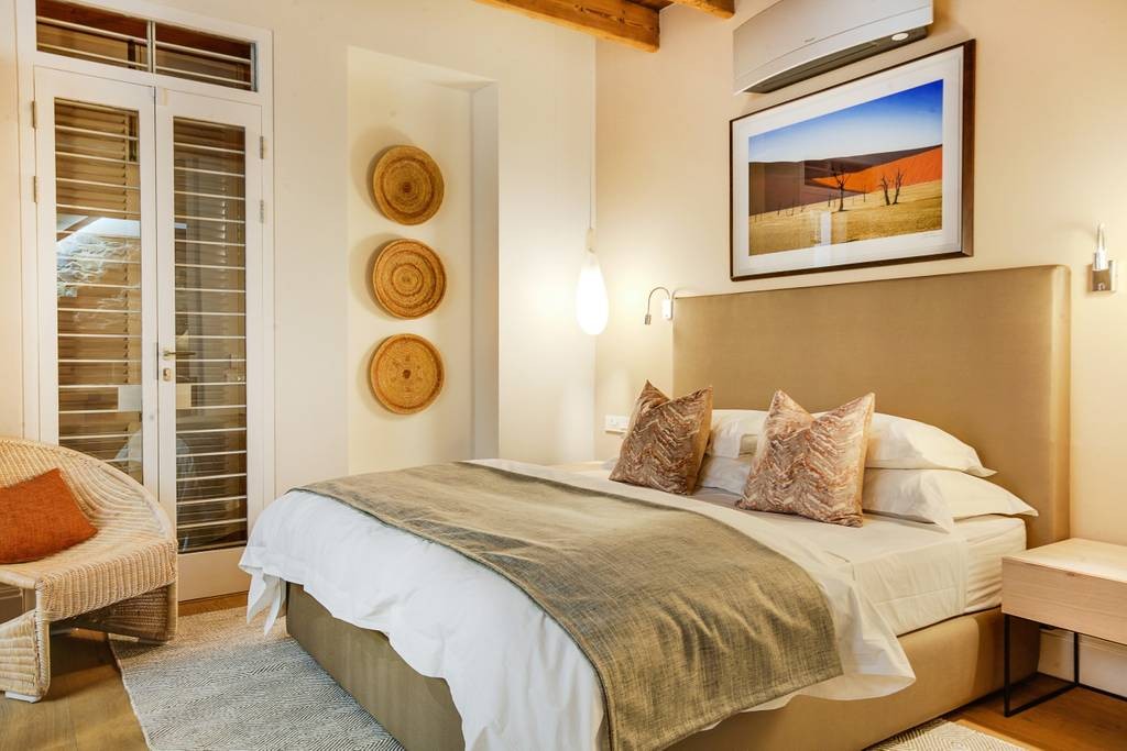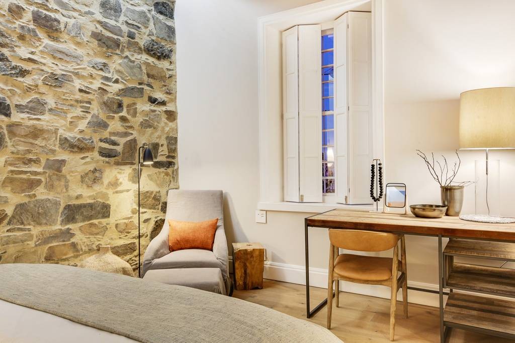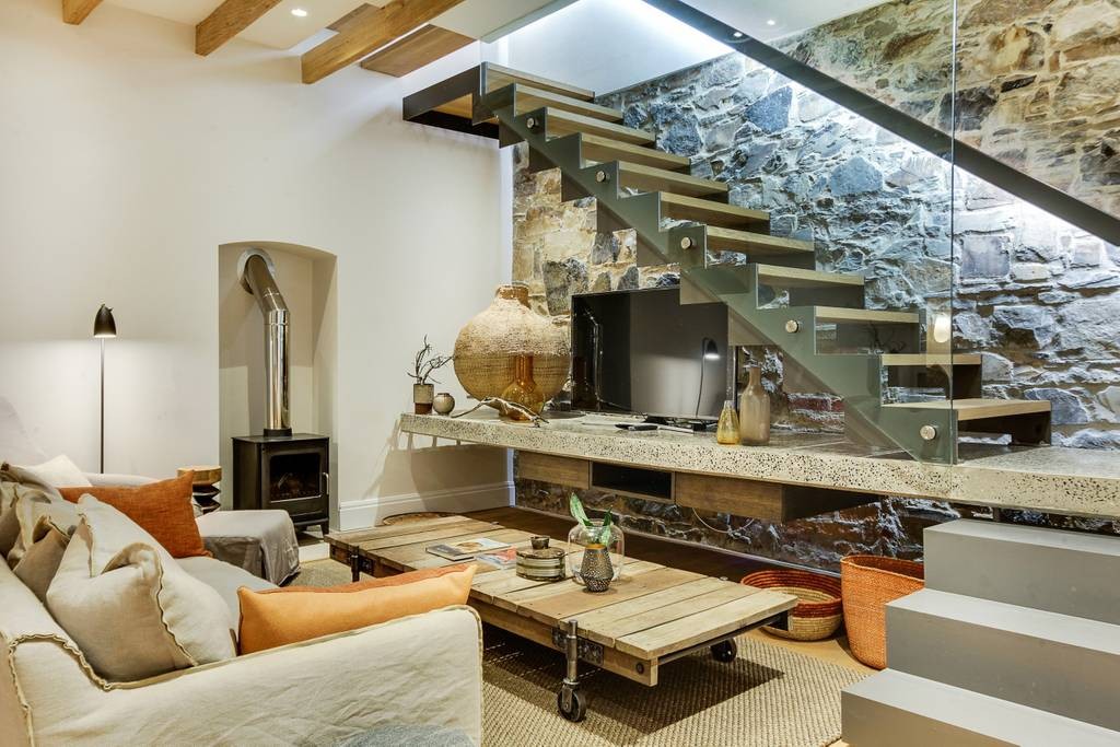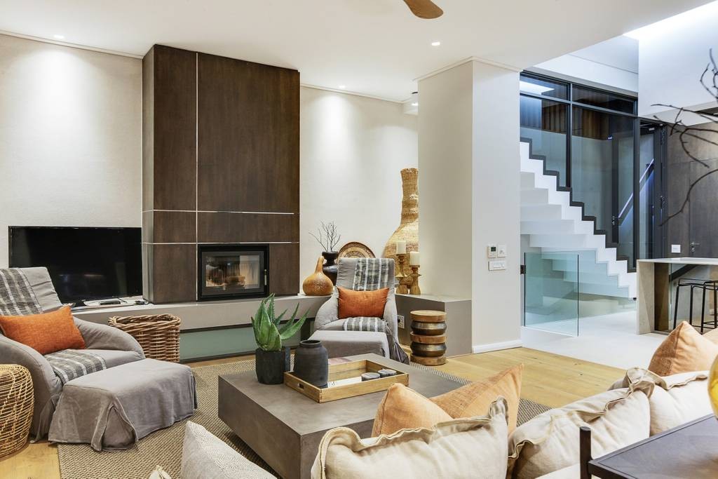 The interior has an industrial feel, with exposed rock feature walls, a metal staircase and artistic light fixtures. The colour scheme features rich tones that create a welcoming and inviting space. With plenty of space for family or friends, the apartment offers two TV lounges, dining for eight guests and a fully equipped kitchen. Both lounges have fireplaces, to ensure that the apartment is comfortable all year round. Foldaway doors in the dining room open onto a patio with a lovely outdoor dining area and swimming pool.