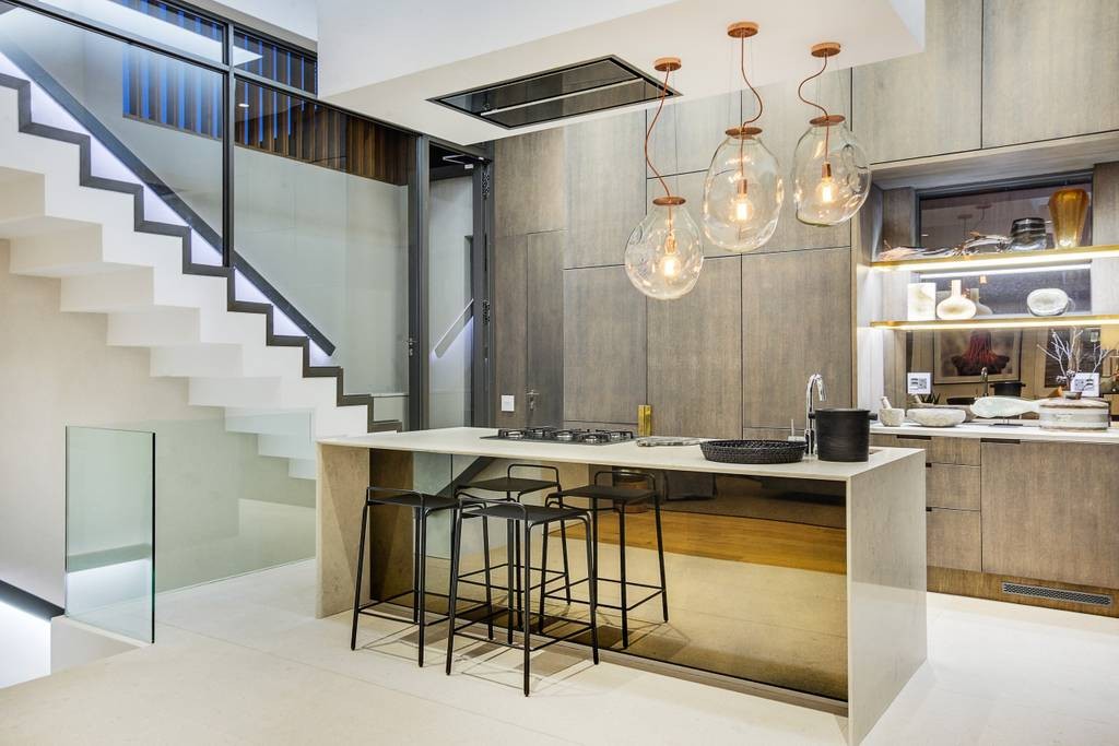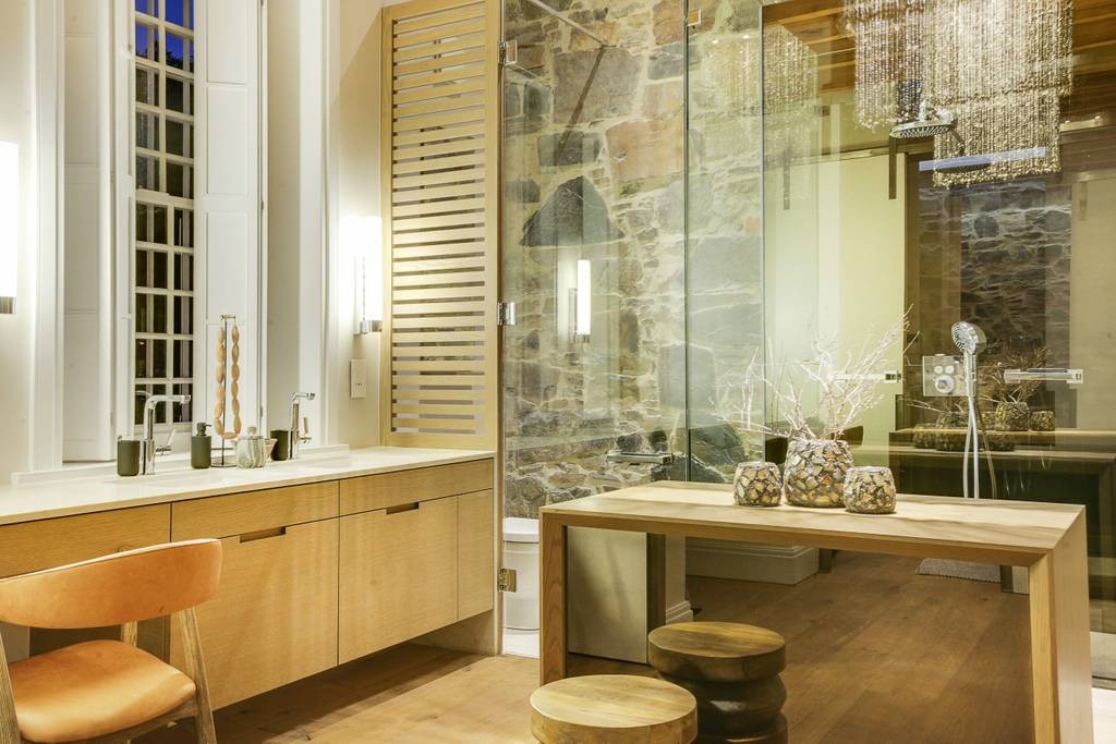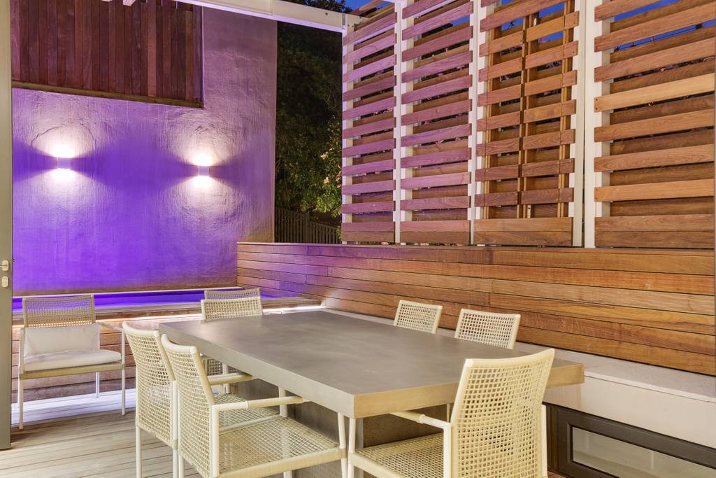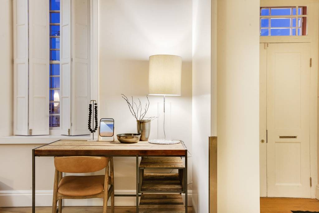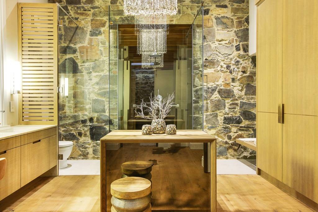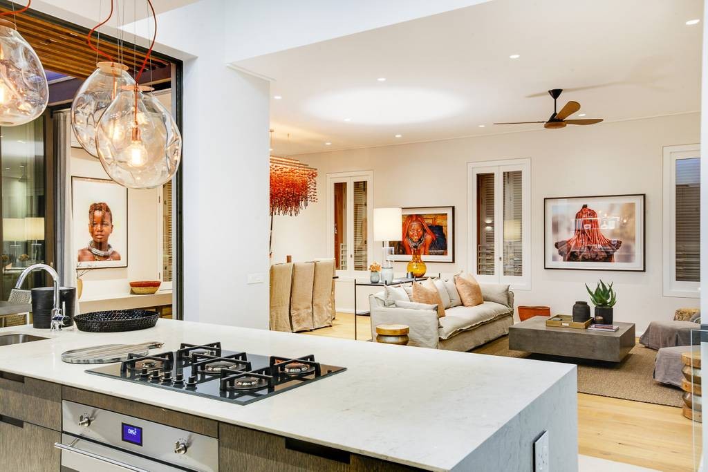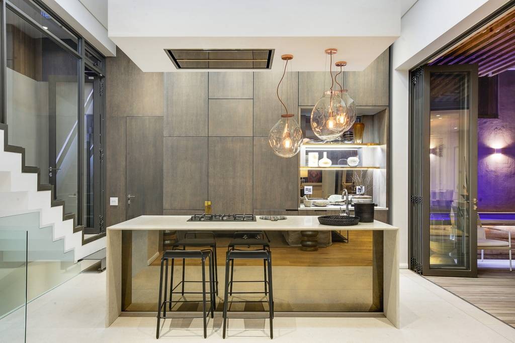 The interior has an industrial feel, with exposed rock feature walls, a metal staircase and artistic light fixtures. The colour scheme features rich tones that create a welcoming and inviting space. With plenty of space for family or friends, the apartment offers two TV lounges, dining for eight guests and a fully equipped kitchen. Both lounges have fireplaces, to ensure that the apartment is comfortable all year round. Foldaway doors in the dining room open onto a patio with a lovely outdoor dining area and swimming pool.