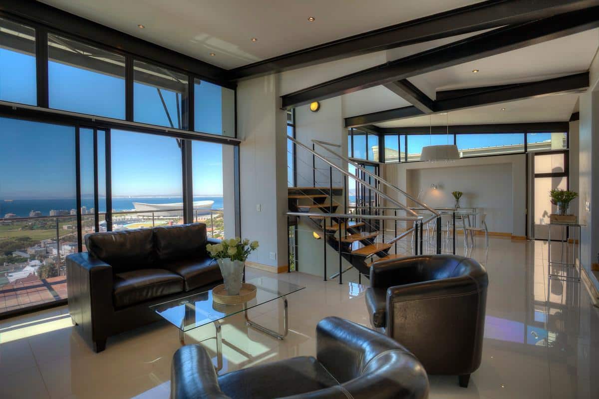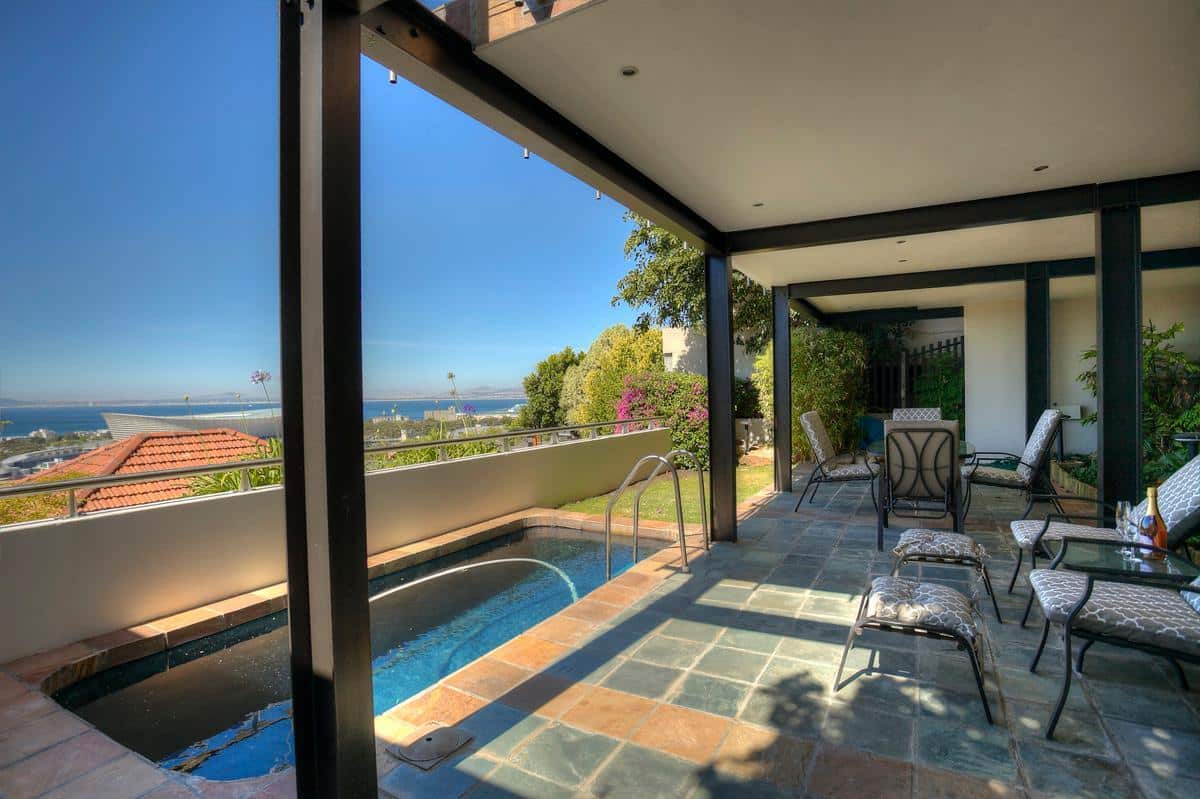 This magnificent three bedroom vacation rental boasts breathtaking sea views, offering great comfort and wonderful luxuries. This holiday haven is situated in a very quiet and private road at the top of Greenpoint in one of the highest roads on Signal hill, and features a small swimming pool and garden area – an absolute treat. It has a chic contemporary feel with openness akin to the vast expanses of the wide ocean. The house is centrally located to the hub of the city, Waterfront and the beachfront.