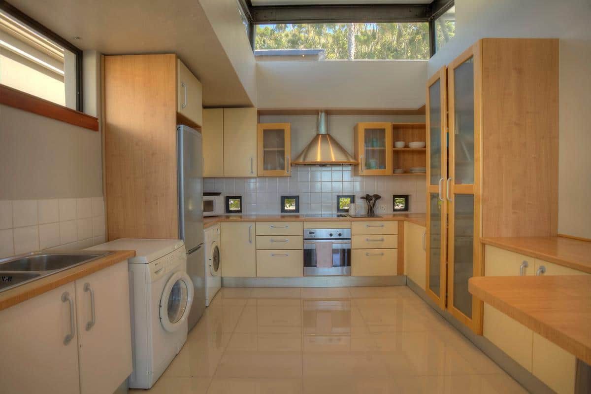 The open plan kitchen is equipped with the latest conveniences. This flows into the dining room with 6 seater glass dining table. The top / ground level also has comfy lounge area with wall hung HD LED TV, with jet-master “stove” fire place plus guest toilet. On the 2nd / middle level – the main bedroom is very spacious with queen size bed and en-suite bathroom with separate bath and shower and double basins. This room is equipped with a LED wall hung TV and breathtaking views of the ocean. The 2nd and 3rd bedrooms are smaller but very comfortable, both having double beds and sea views. There is a second bathroom with large soaking tub and double basin. On the bottom /third level of the property is a small dip pool as well as large tiled patio with green and shady landscaped open and covered gardens.