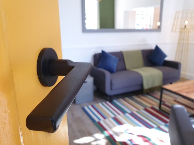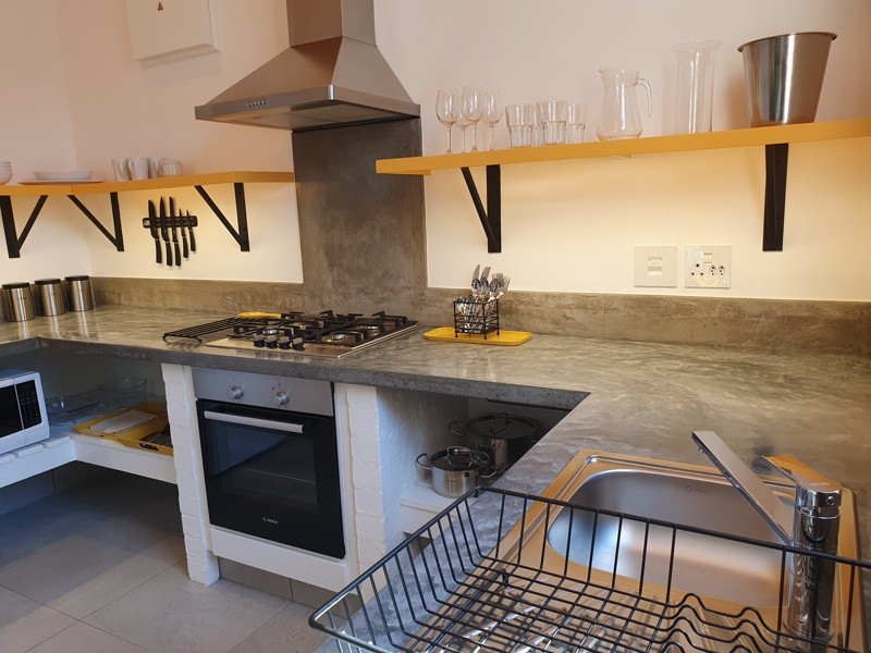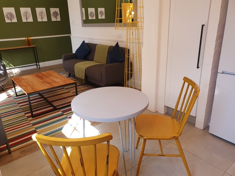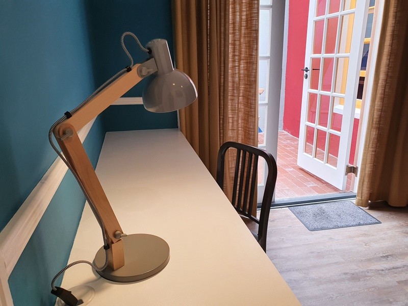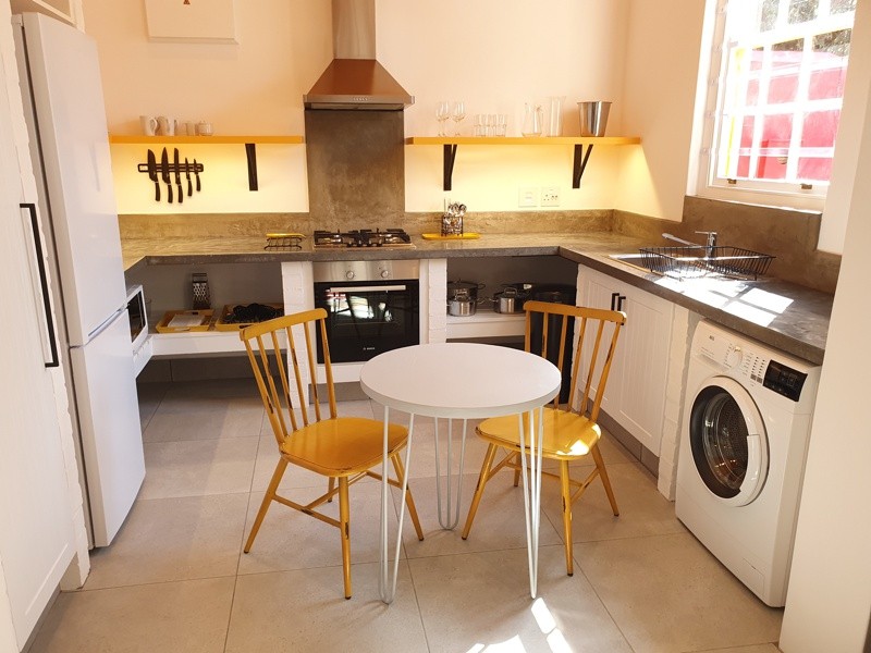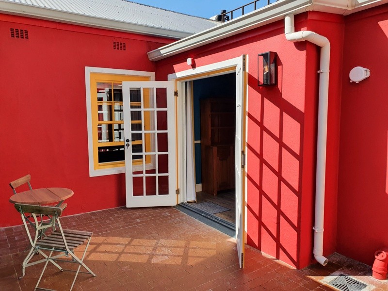 A great place to “work from home” or use for leisure, traditional pavement steps lead you to the sunshine-yellow front door and raised red terrace. The open plan living area and kitchen face Waterkant Street, with plenty of light from the front sash windows. The fully fitted kitchen, with concrete work tops, white bricks and yellow ceiling, has seating for two.
