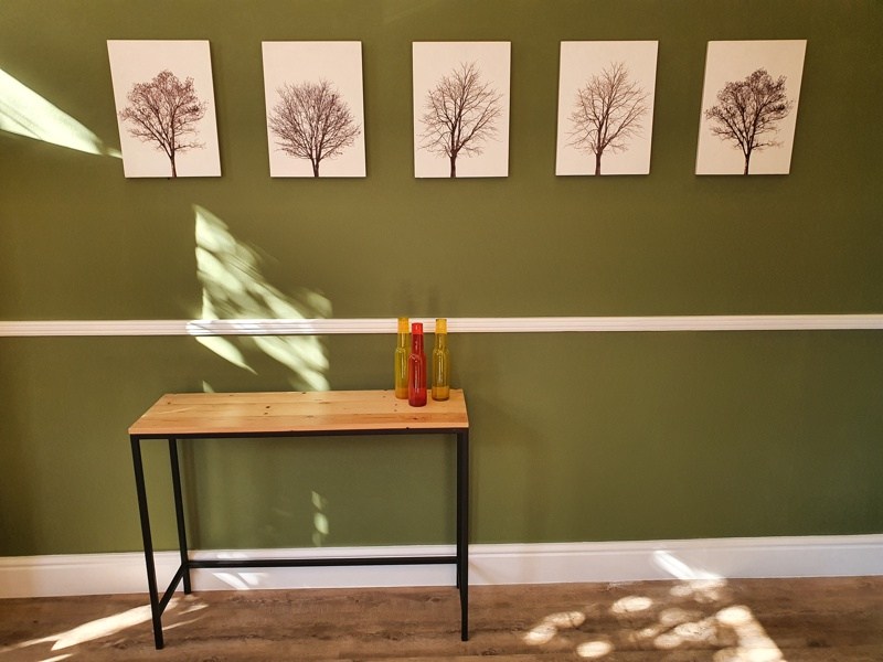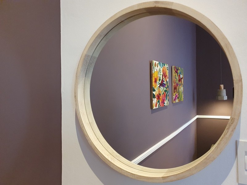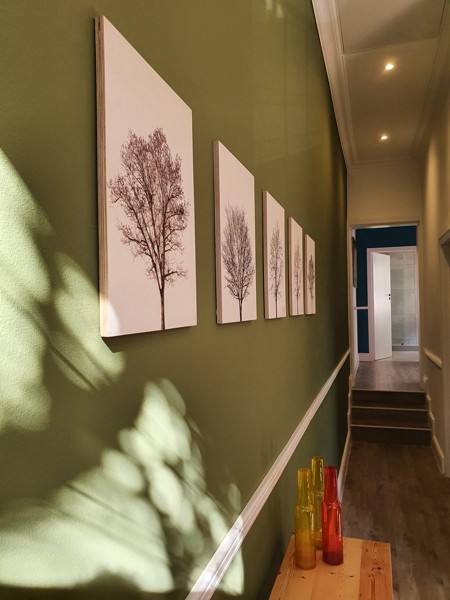 An olive feature wall wraps around the living room and along the corridor that connects to the bedroom with aubergine, grey and white colour scheme, ceiling fan and overlooks the private courtyard.