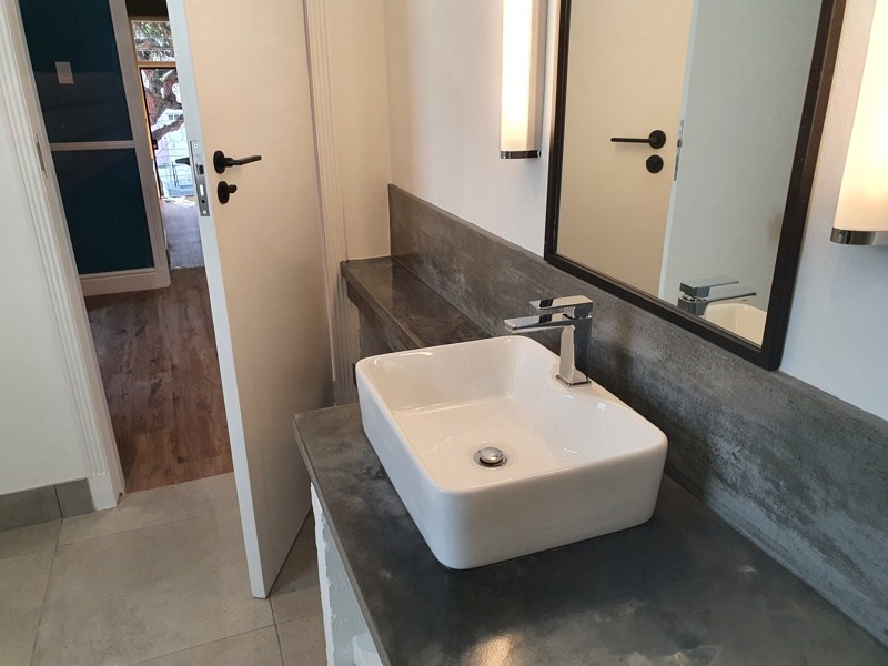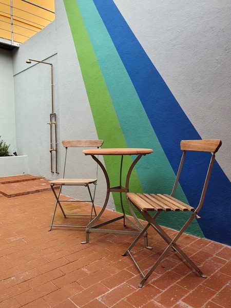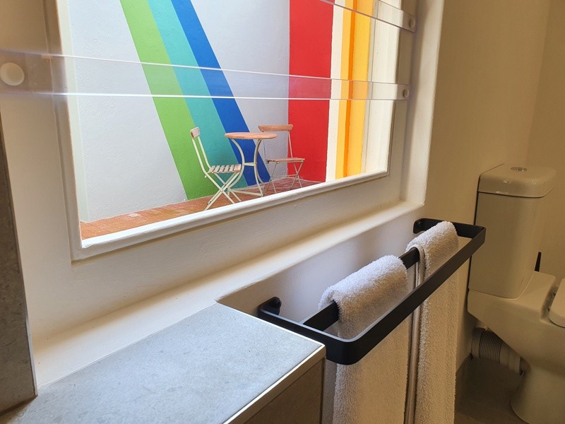 The same corridor opens onto a blue study area with French Windows to the brick-paved courtyard with outdoor shower, seating and colourful wall art. The stylish grey tiled bathroom, with a concrete sink counter, has a large shower, again overlooking the outdoor area.