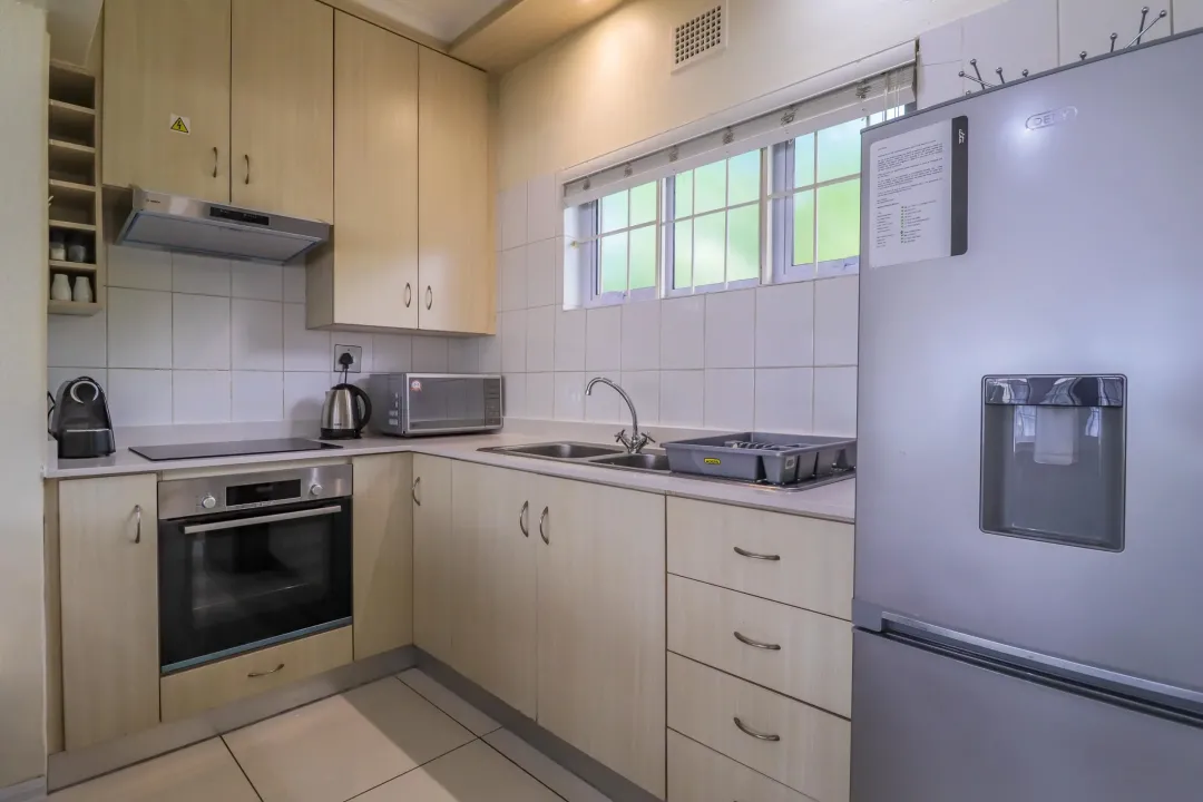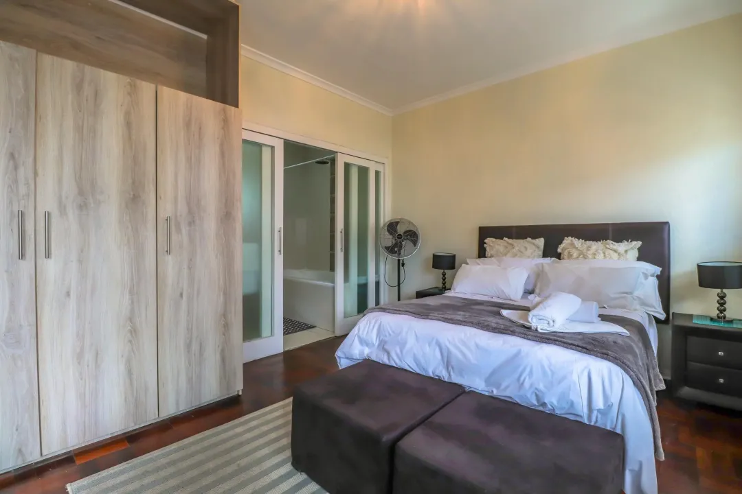 The living room still has the original parquet wooden flooring with lots of character. There are two comfortable modern two seater couches in the lounger as well as two ottomans which double up as a mattress for extra sleeping arrangements for children. The large flat screen TV can be watched from either the couch in the living room or from the bedroom through larger sliding doors.