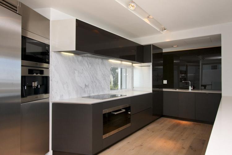 Modern fully equipped kitchen with a Viking fridge, Miele, dishwasher, Miele stove, Miele coffee machine, Miele wine cooler and Bosch washing machine/tumble dryer combination.