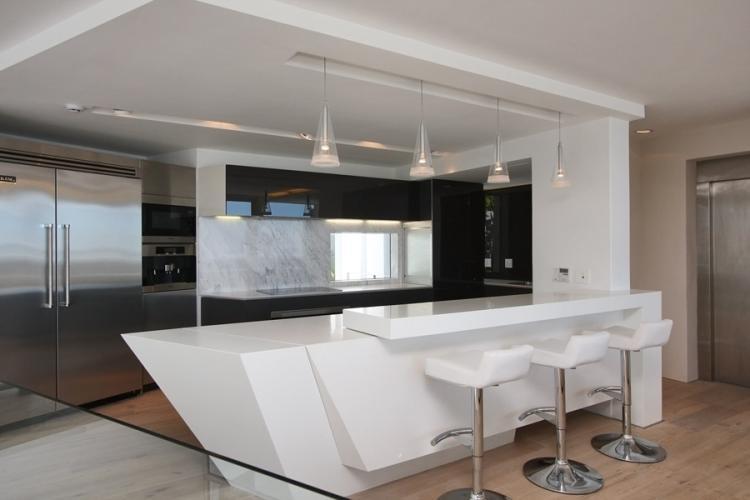 The kitchen has a great view with bar counter and bar chairs