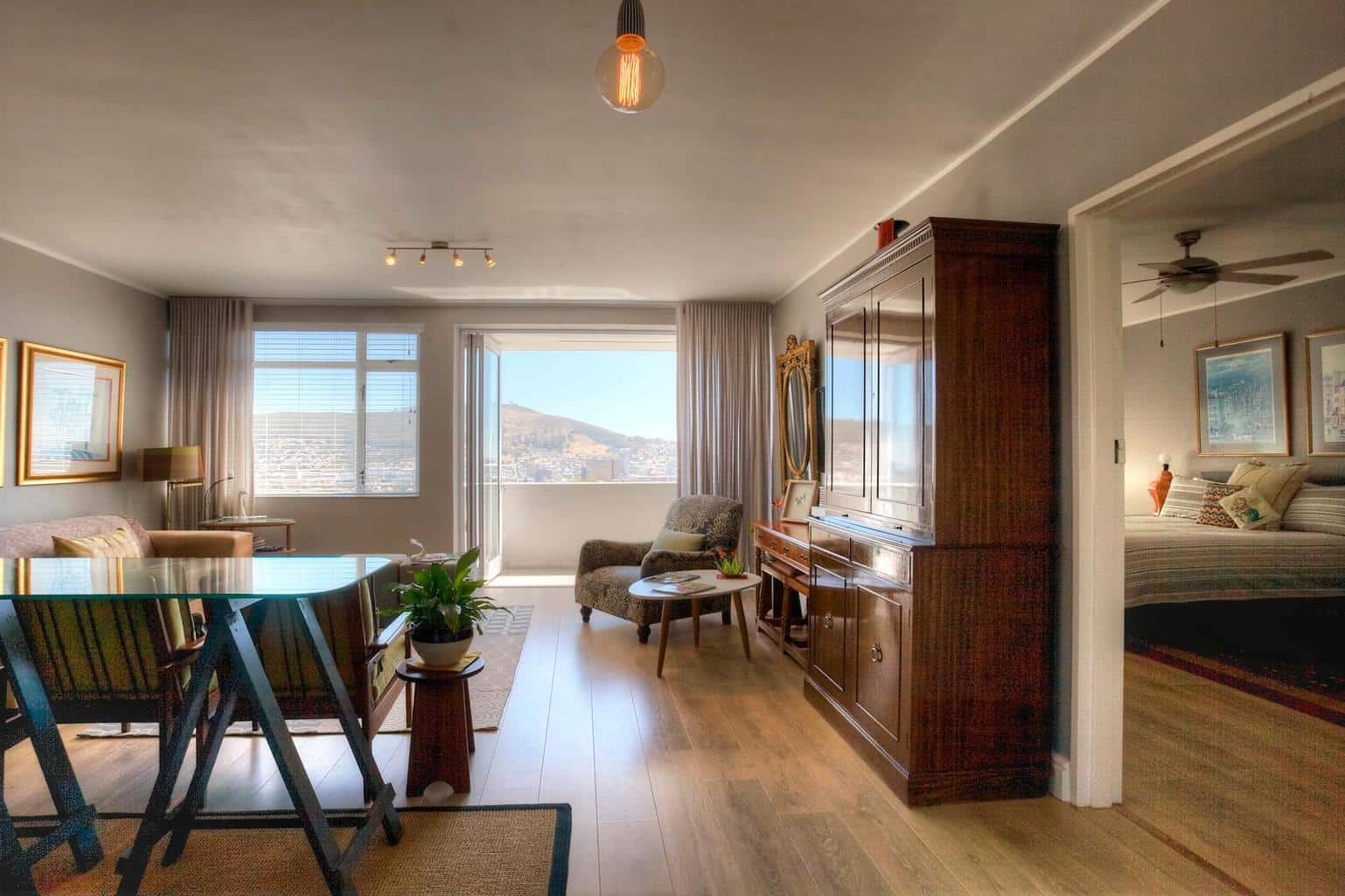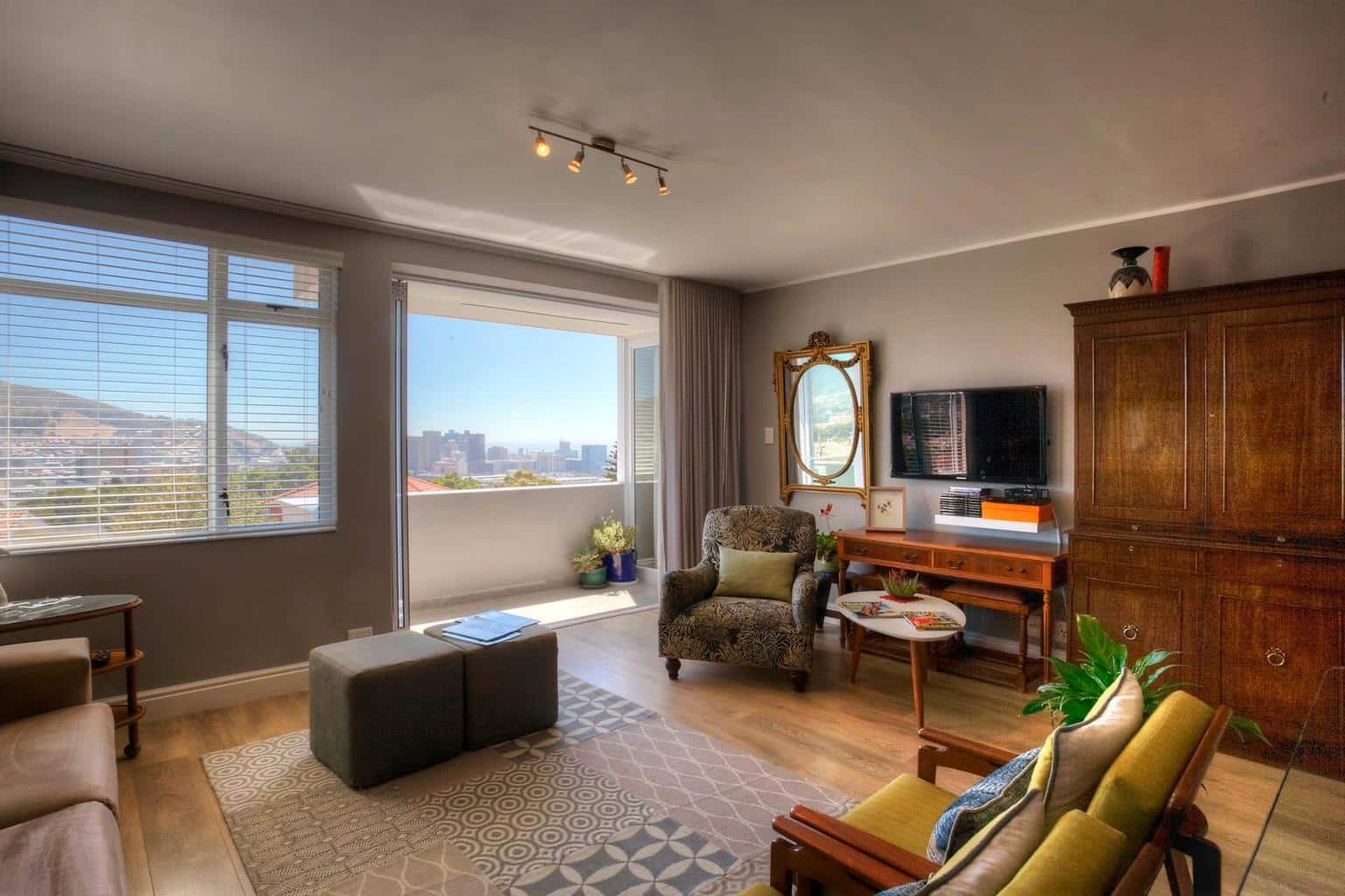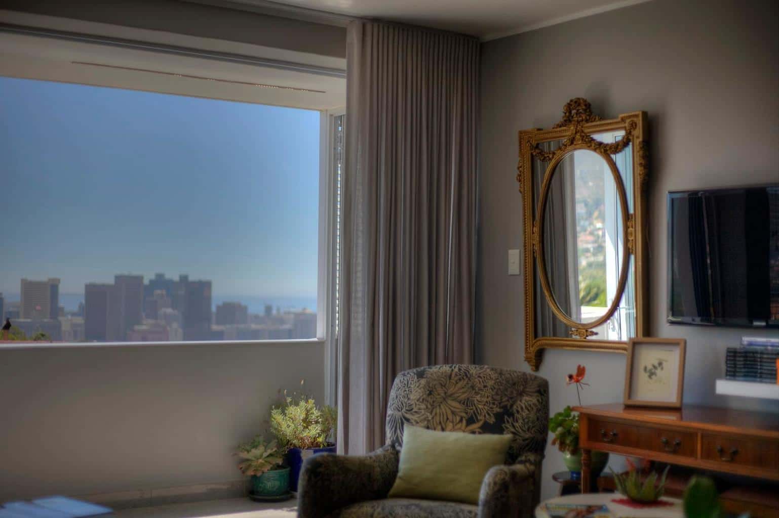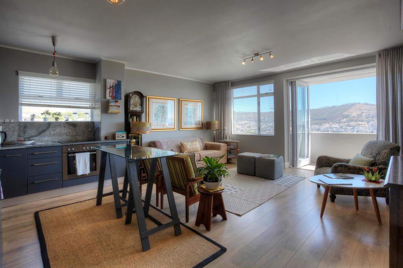This newly decorated apartment is finished in a very classic style, with a touch of modern design. The apartment is sunny and has amazing views of the city, the harbor, city bowl, Lions Head and Table Mountain. The apartment is clean and fully equipped. It is in an extremely quiet apartment block in Vredehoek.