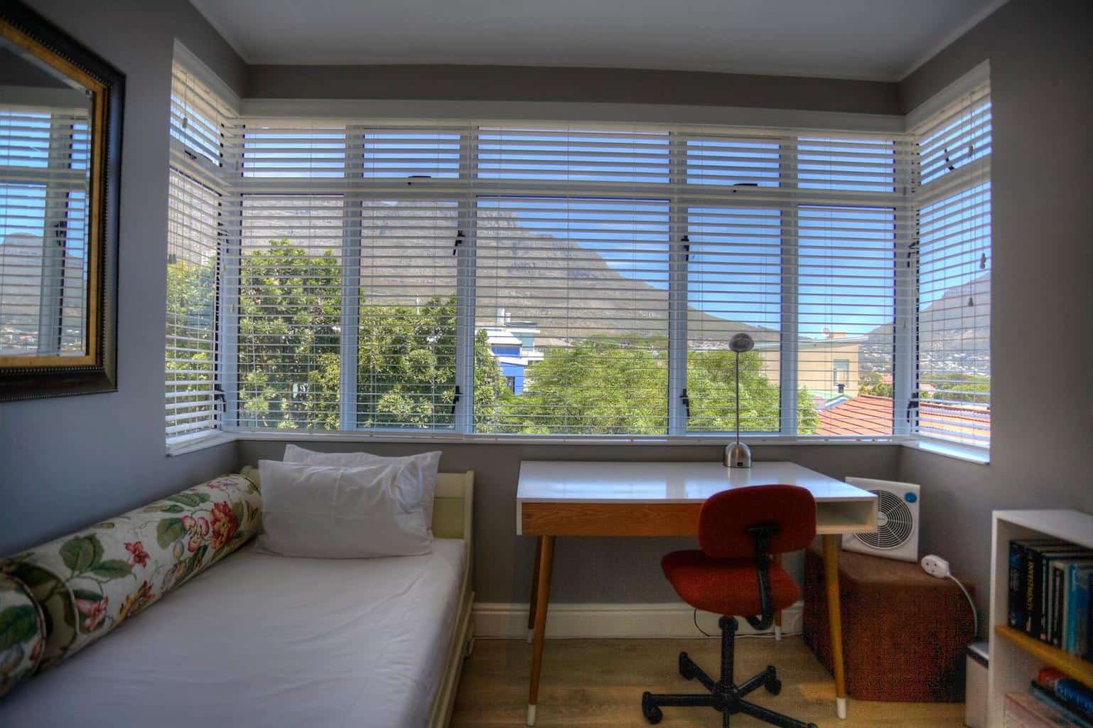 The apartment sleeps 3 people. The study has a day bed and this can work really well for a couple with a small child. The main bedroom has a queen size bed. The second bedroom is small, with Table Mountain views and a three-quarter bed (a little bigger than a single bed). There is one bathroom with a modern shower. There is a wide screen TV (with satellite and a DVD player), as well as a music system. There is uncapped wifi. There will be supplies of tea, coffee, sugar, olive oil etc in the kitchen cupboards as well as some essentials to get you started.