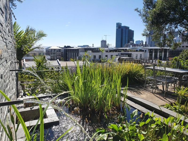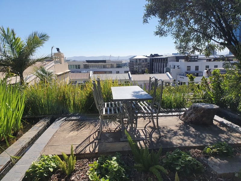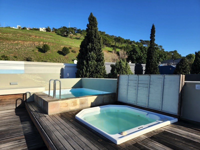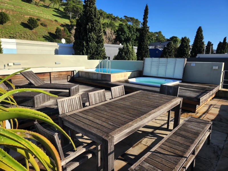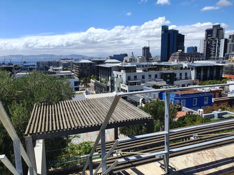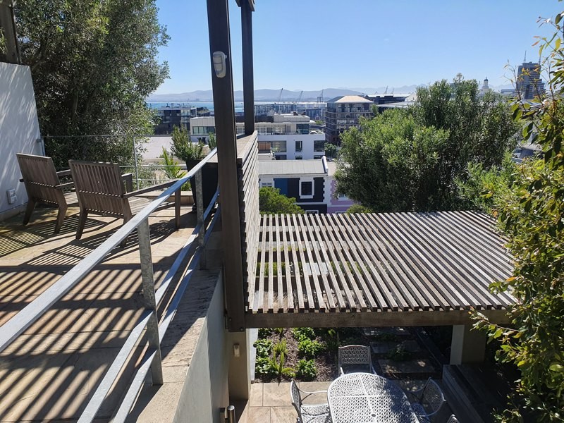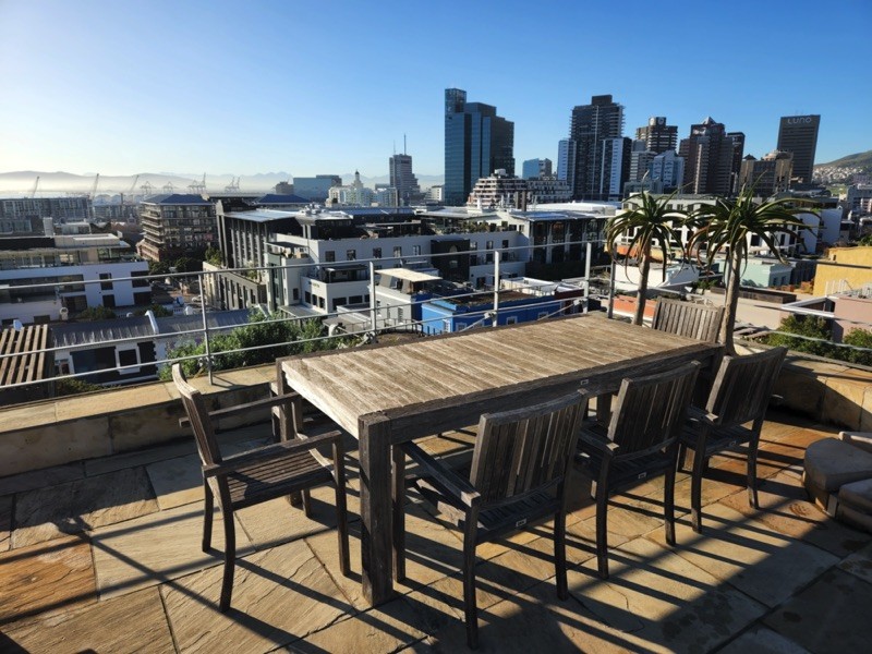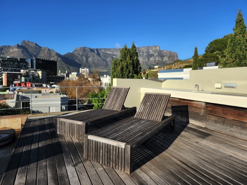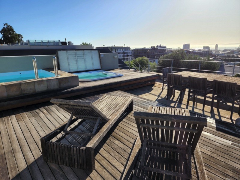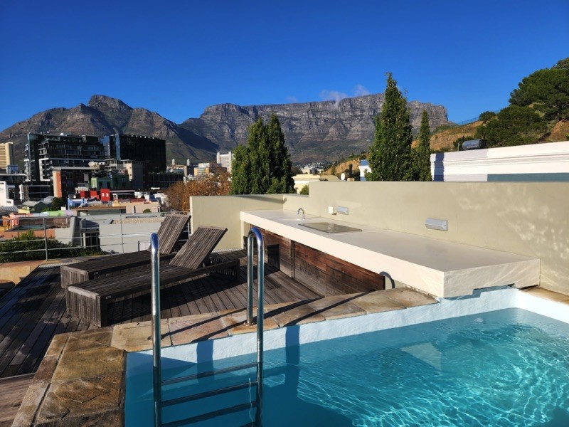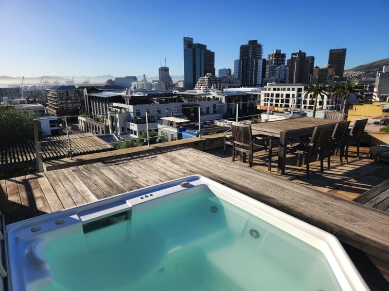 Exterior steps lead you to the roof deck with spectacular 360 degree views of Table Mountain, Signal Hill and the whole city. With it’s plunge pool, hot tub, sun deck, seating and bar counter with sink and built in Braai/BBQ this space is ideal for relaxing or entertaining.