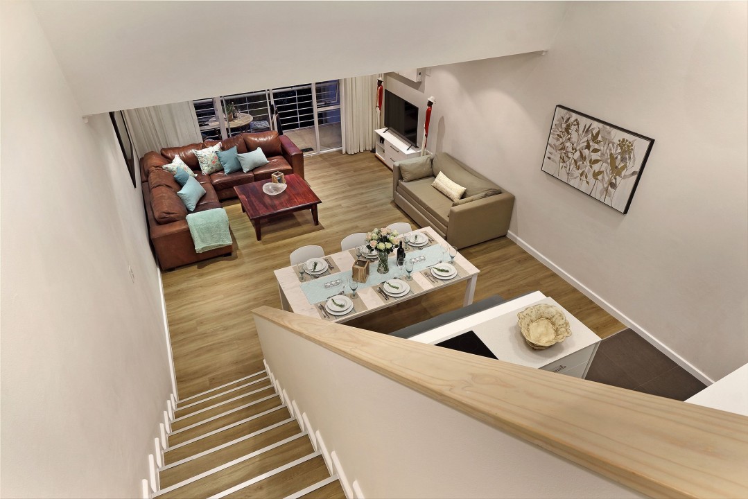 An open-plan lounge with double volume high ceilings and modern kitchen greet you on arrival, all of which flow effortlessly onto a private balcony that overlooks the Atlantic Ocean.