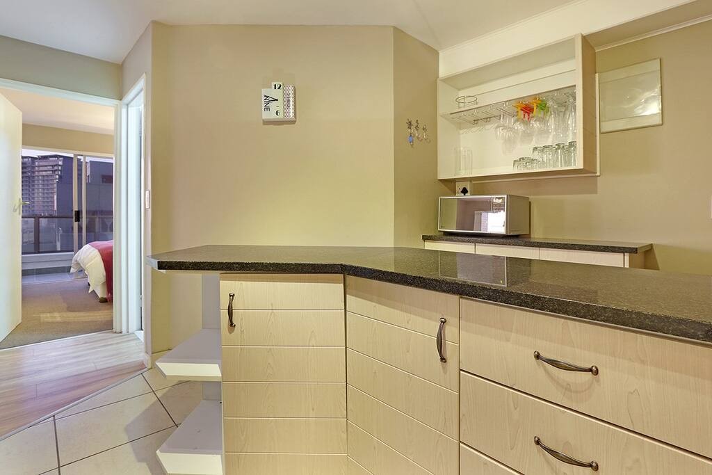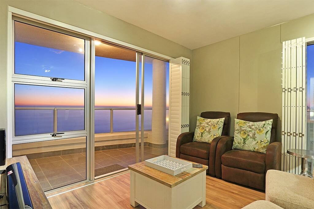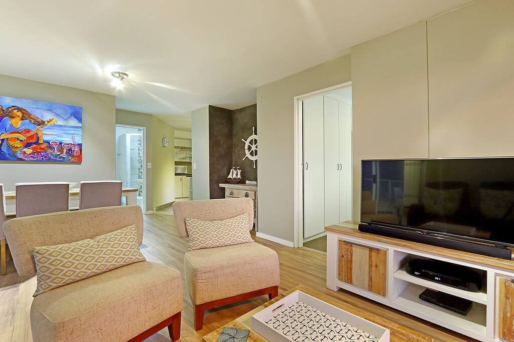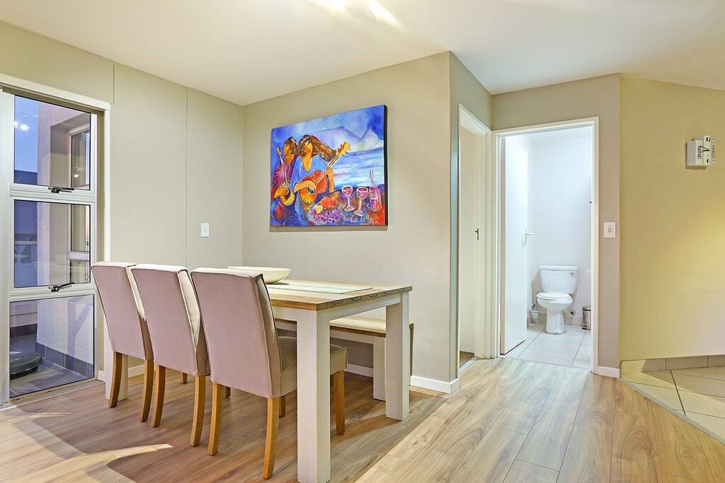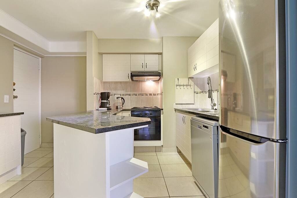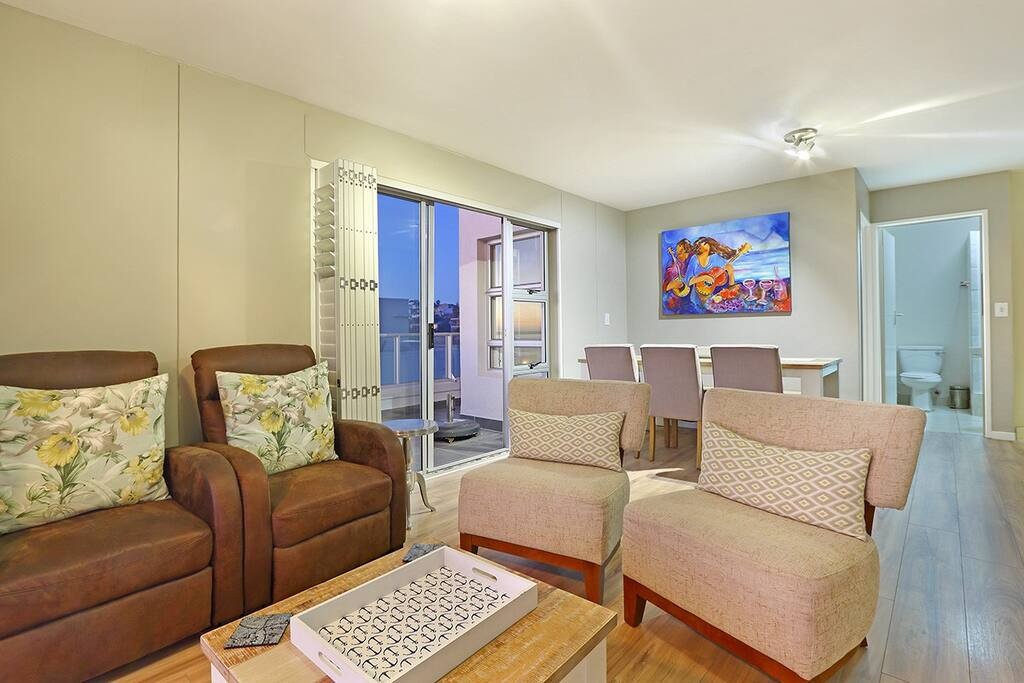 In the other bedroom is a double bed that has access to the balcony. The apartment additionally comes with a second bathroom. One of the bathrooms contains a bathtub and the other a shower. Hairdryers will be provided. 29 Sunset Boulevard has a well-equipped, stylish open-plan kitchen that includes a microwave, oven, toaster, kettle, fridge and dishwasher. This rental also includes a vacuum cleaner as well as an iron and ironing board. The open-plan dining area and lounge are a few steps from the kitchen with the dining area featuring a table with seating for 6.