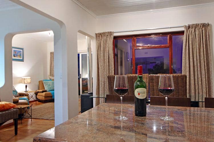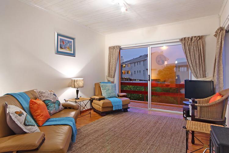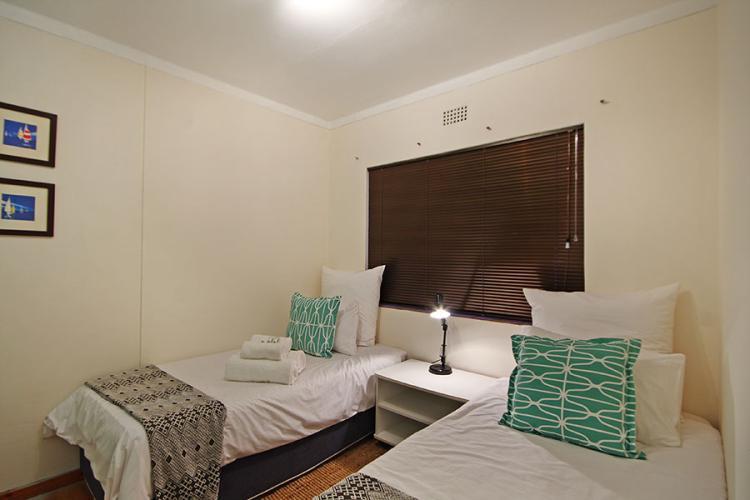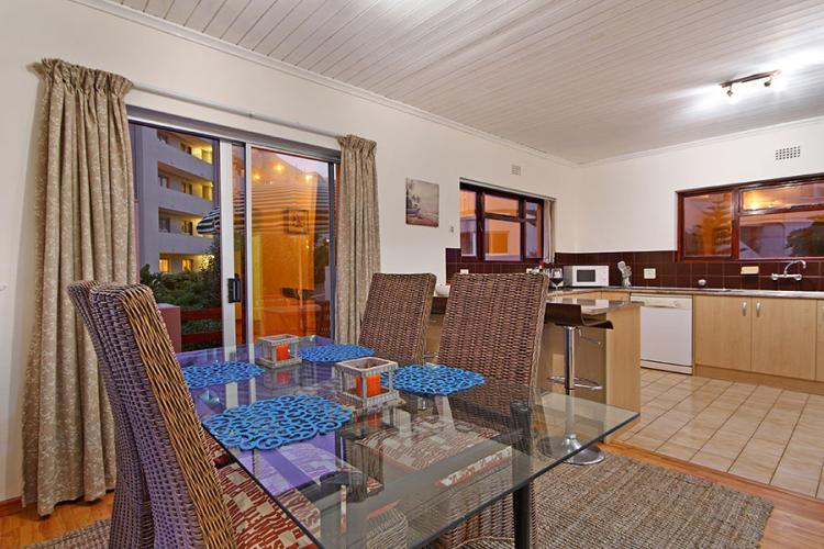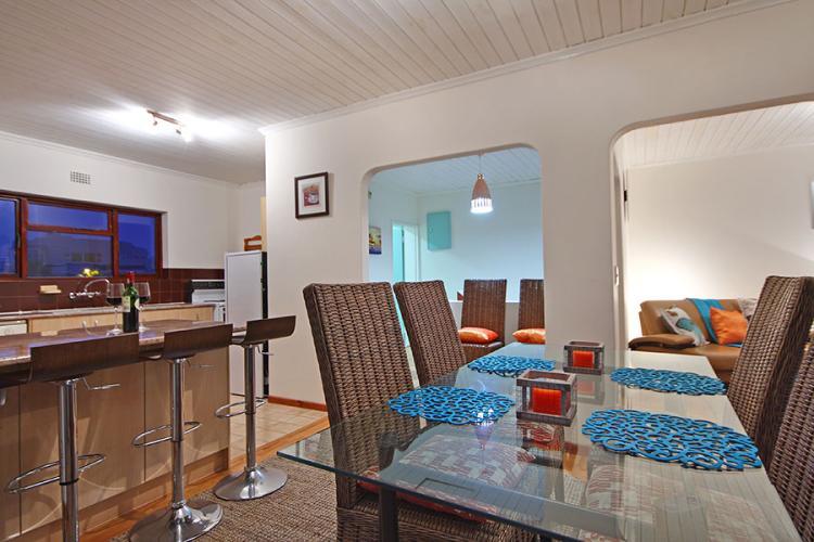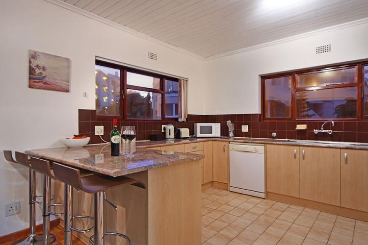 This double storey holiday home offers self catering accommodation for up to 6 guests. All 3 bedrooms are on the ground level and a lovely wooden staircase takes you up to the open plan kitchen, dining area, lounge and balcony offering a beautiful view of our famous Table Mountain and the sea. Access is gained by the use of a remote and there is secure parking for 2 cars.