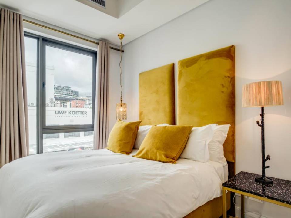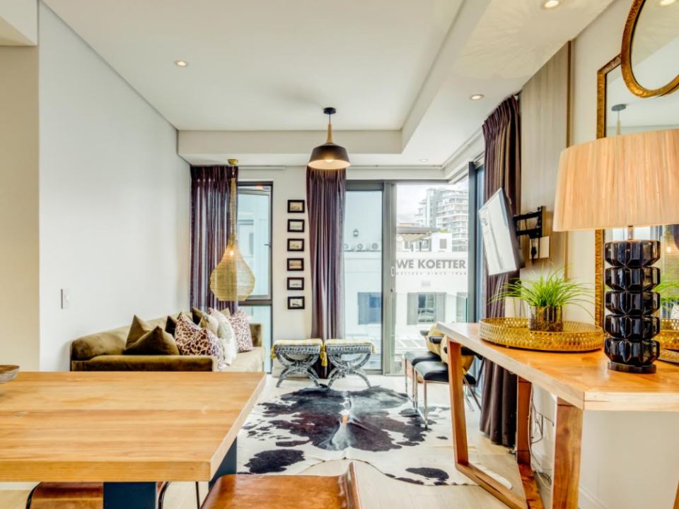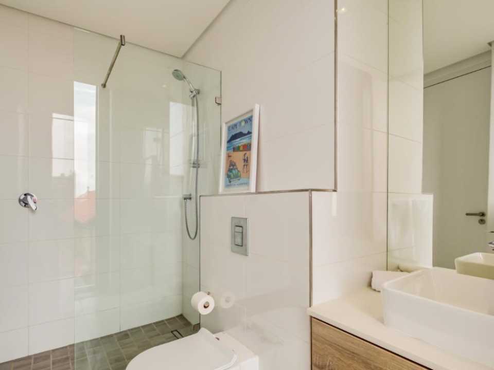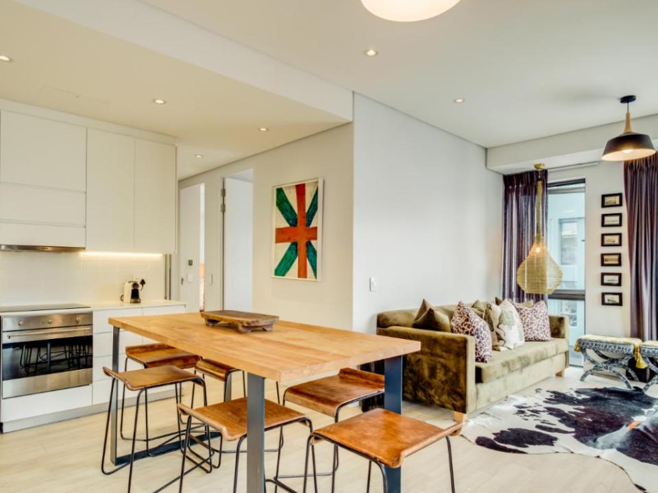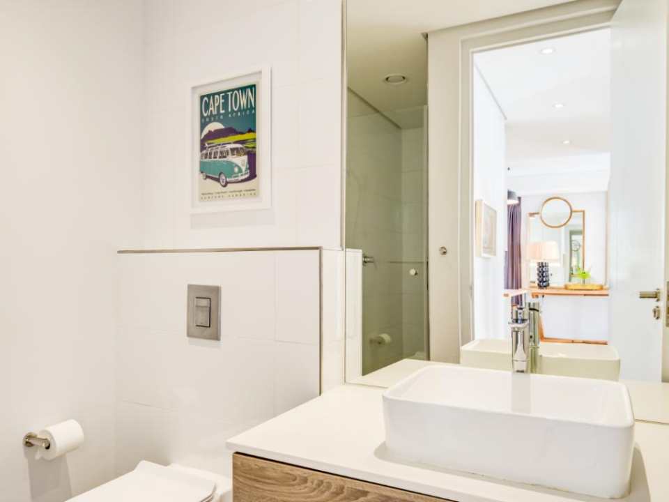 Centrally located in the suburb of De Waterkant, this modern 2-bedroom apartment is in a secure building. The stylish living area has a lounge with a large TV, dining bar, and kitchen. This area has large glass doors which open onto great city and mountain views. Both bedrooms have plush beds and their own bathrooms with a shower.