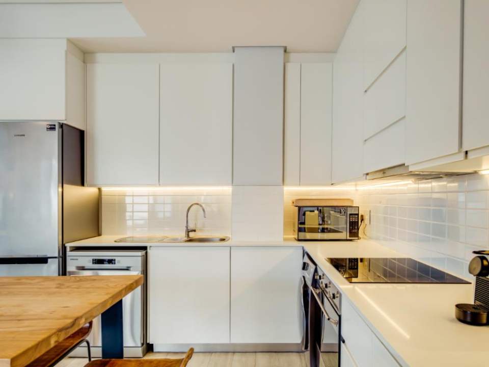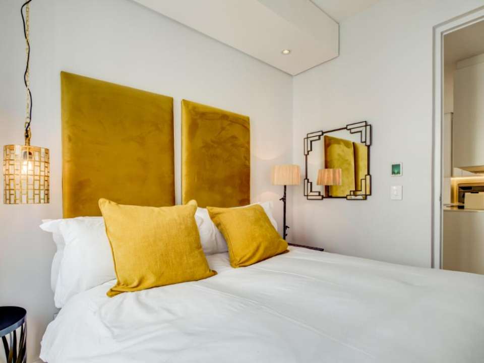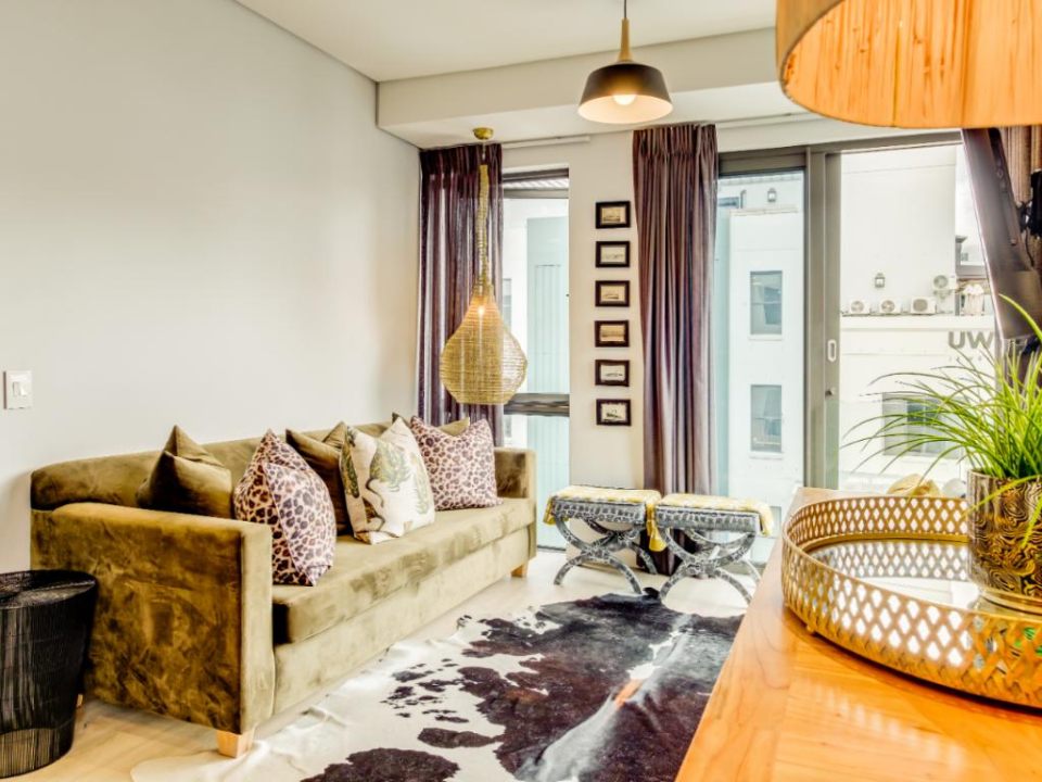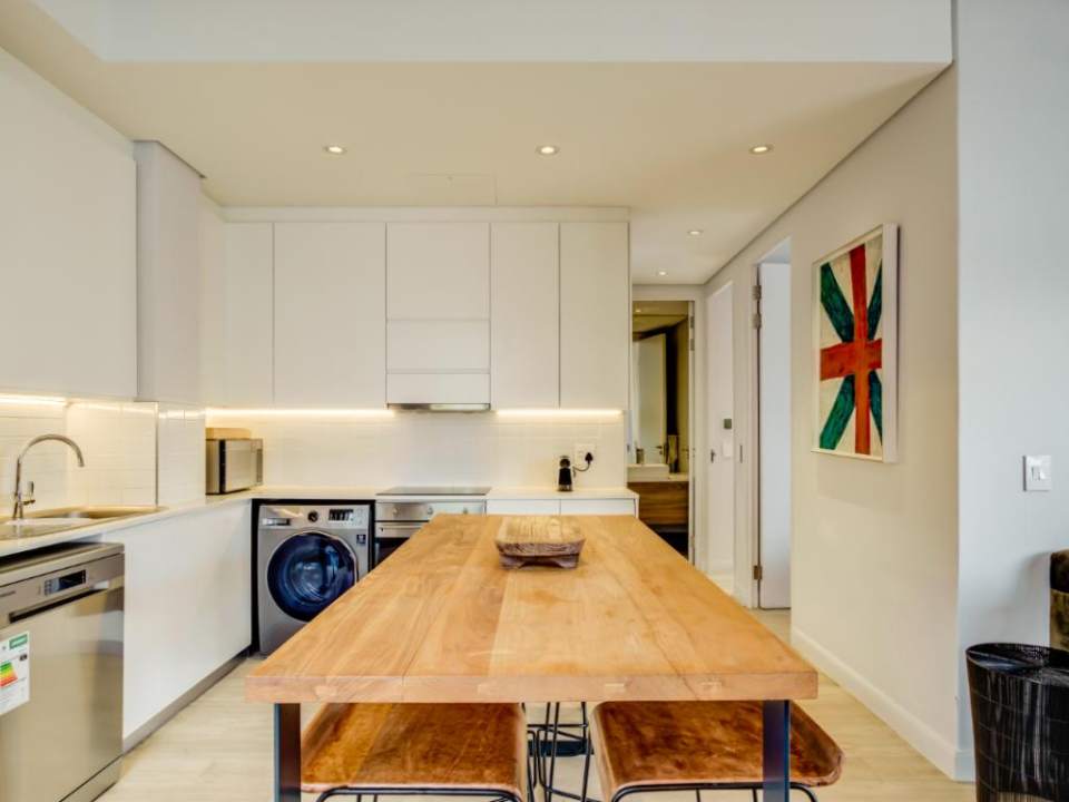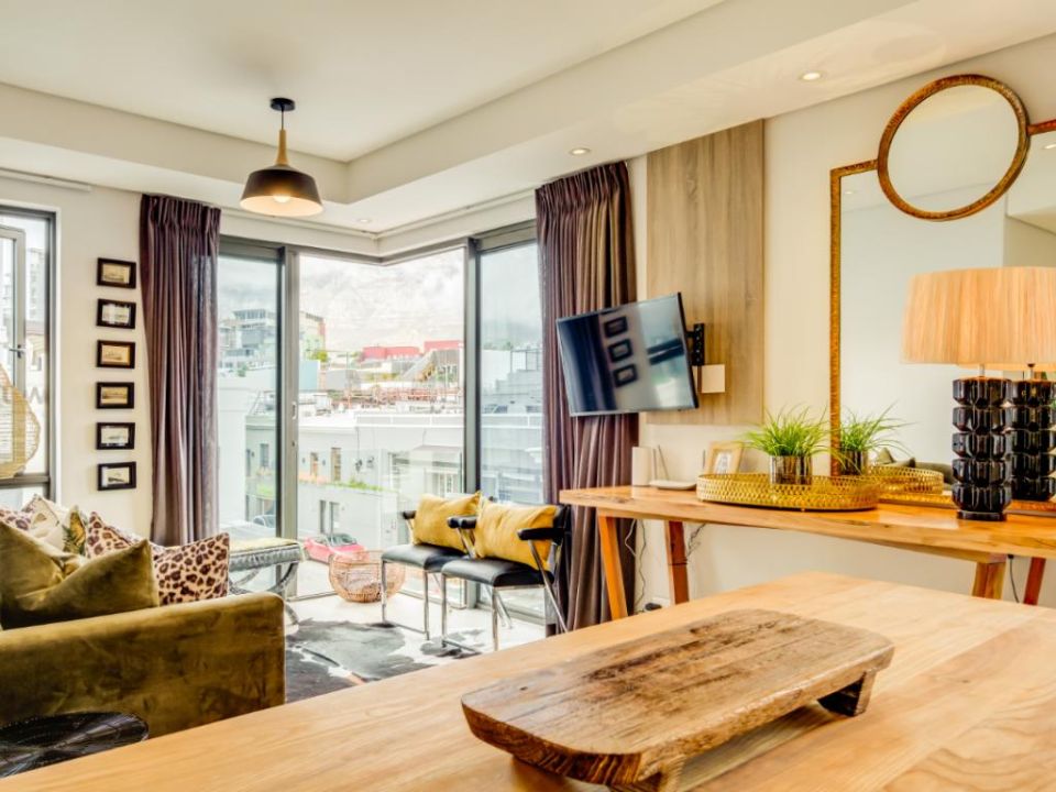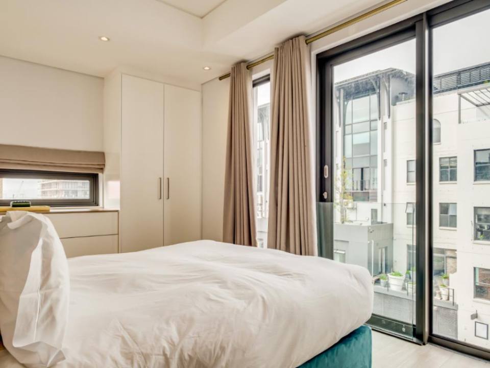 Centrally located in the suburb of De Waterkant, this modern 2-bedroom apartment is in a secure building. The stylish living area has a lounge with a large TV, dining bar, and kitchen. This area has large glass doors which open onto great city and mountain views. Both bedrooms have plush beds and their own bathrooms with a shower.