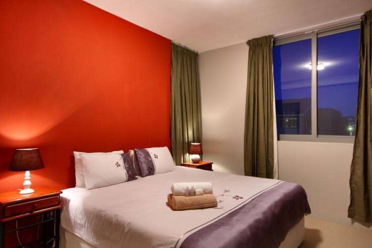 The master bedroom has a queen bed and shares the en-suite bathroom with the second bedroom, furnished with a double bed.