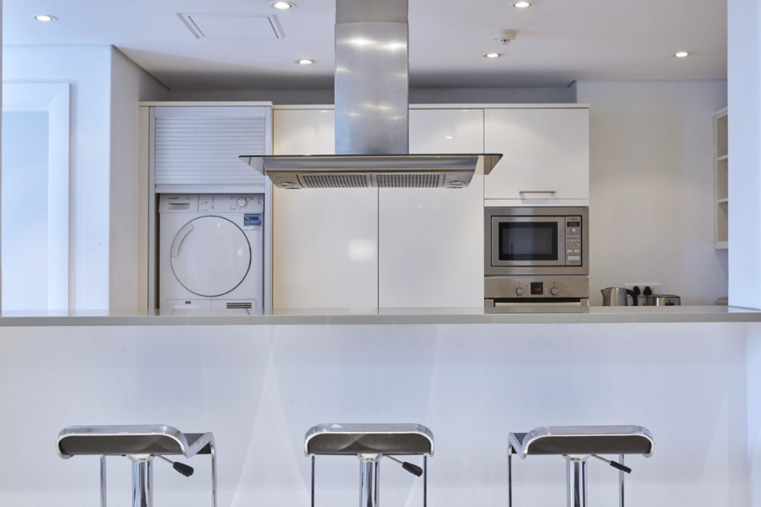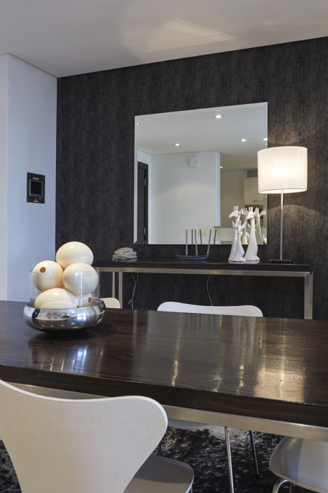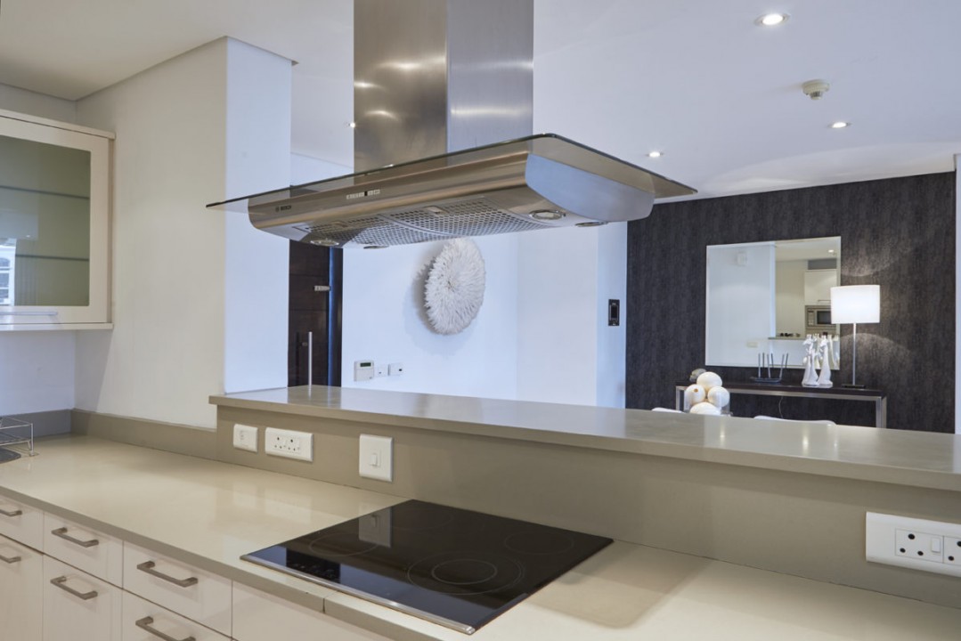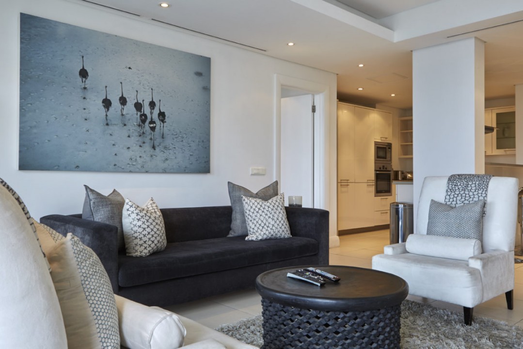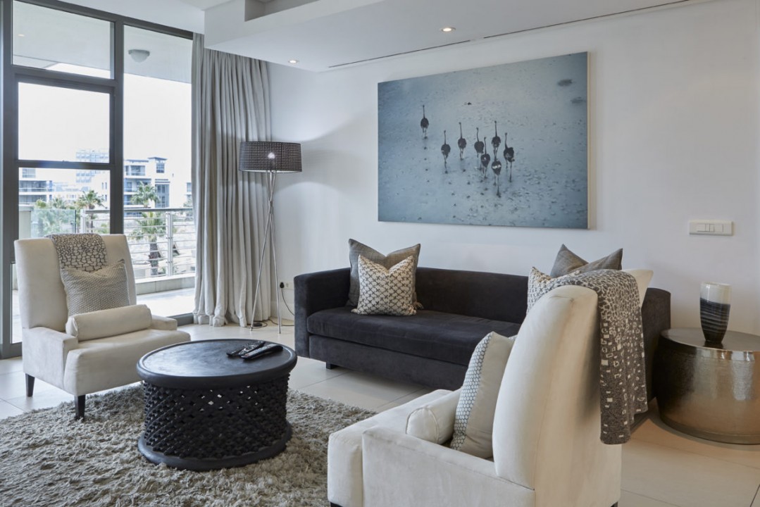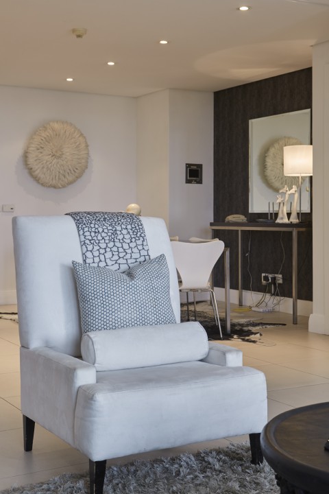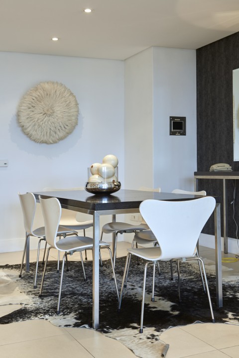 For Guests we have created an apartment that is modern and stylish with a touch of Africa. Couches are specifically designed and custom made. Original works of art from local artists. Crema Marfil Marble in all bathrooms which is continued into the Poggenpohl kitchen.