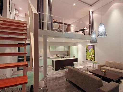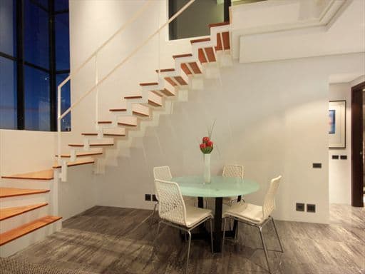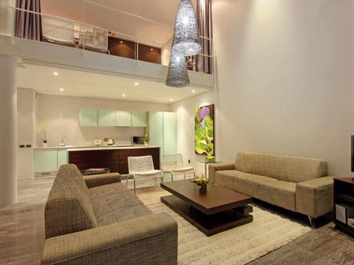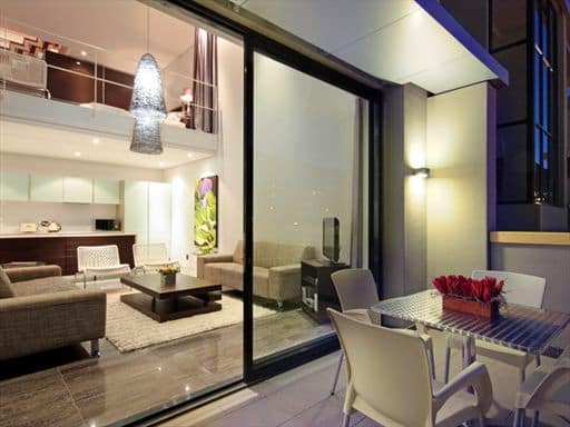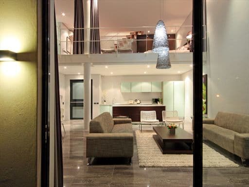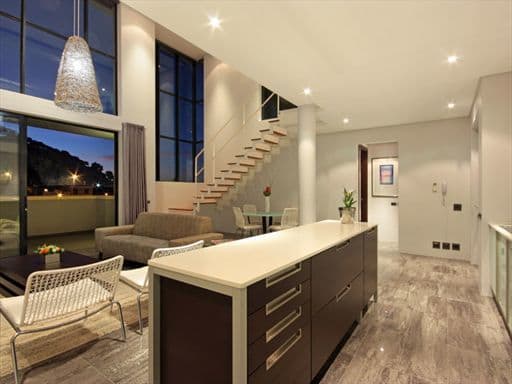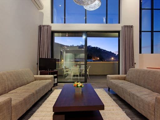 The lower level of the luxury apartment houses the main entertaining area. It is open-plan with the living and dining areas making full use of the views at the front of the apartment. Glass doors let in the breeze and when open, the flow from inside out is seamless. Slick lines, glass, chrome and dark wood create a cool yet chic tone ideal for a business person or couple sharing with an eye for contemporary design and attention to detail.