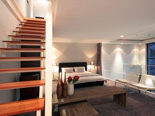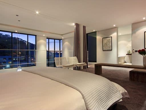 A wooden staircase leads from the entertainment area to the second level where you will find the well appointed en-suite Master bedroom. A king sized brown leather bed with satin and silk sheets, designer wooden furniture and breath taking views await you. The generous en suite bathroom offers a large bath, walk in shower and basin with lots of cupboard space in the same cool tones found throughout the apartment.