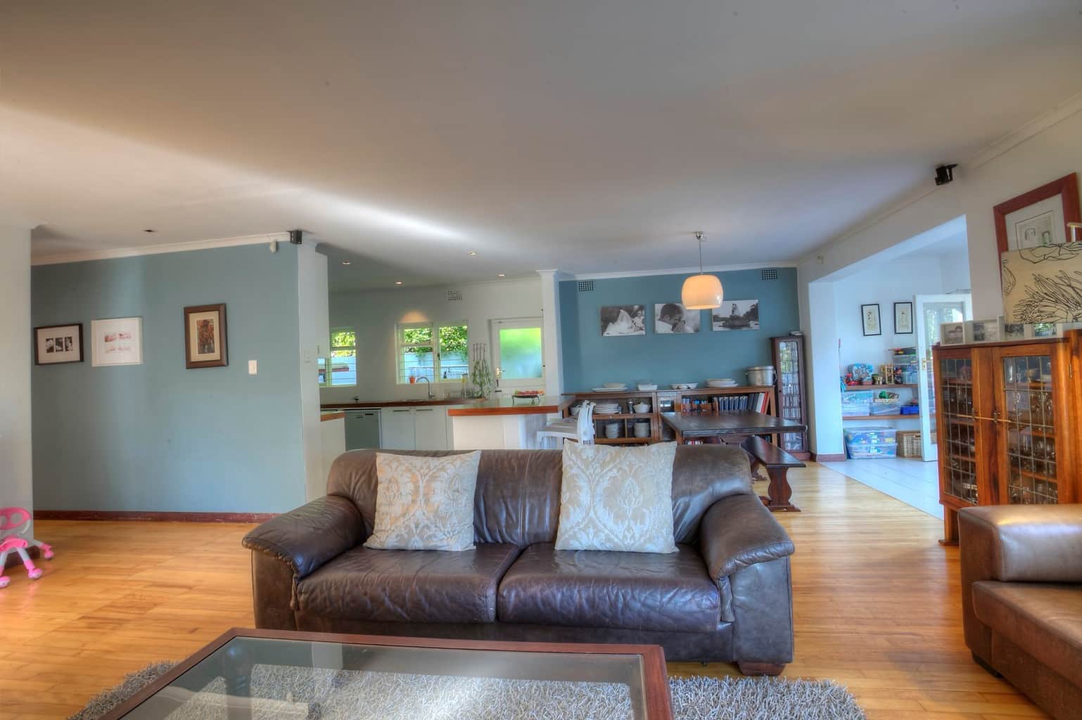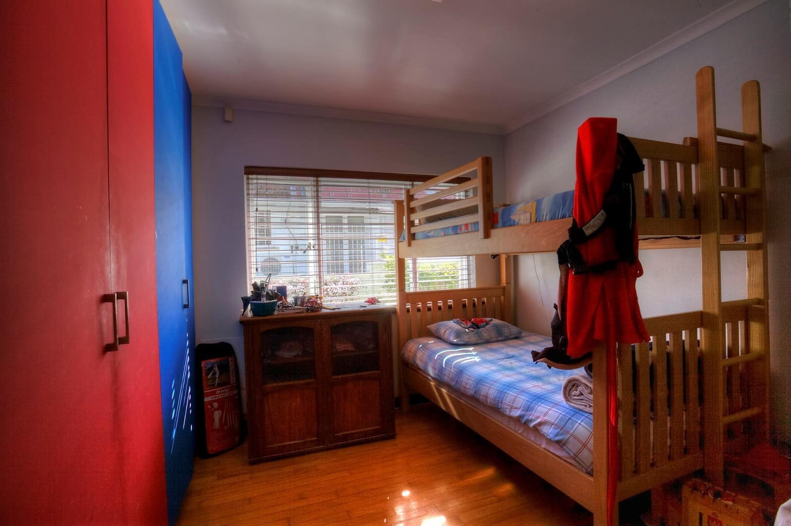 The main bedroom has a king size bed with un-suite shower and basin and then 2 kids bedrooms sharing a bathroom (shower and bath). The 1st kids room has a bunk bed and the 2nd kids room has a ¾ bed. Please note only 1 toilet in the main house.