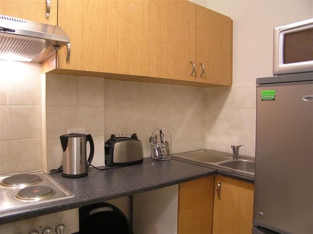 Light & bright bedroom / living room with desk / small dining table. Two comfortable wingback chairs and huge sliding windows with views towards Table Mountain. The kitchen is separate from living / sleeping area, and is fully equipped with fridge, stove (hob/plates & oven), microwave oven, kettle & toaster. Full range of crockery & cutlery.