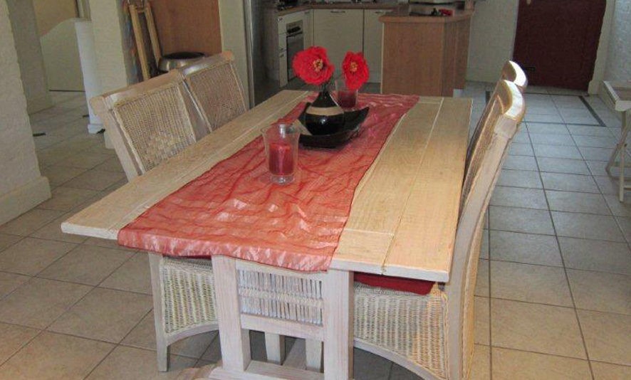 There is a dining area with dining room table and chairs which leads to the lounge with comfortable couches and Satellite TV.