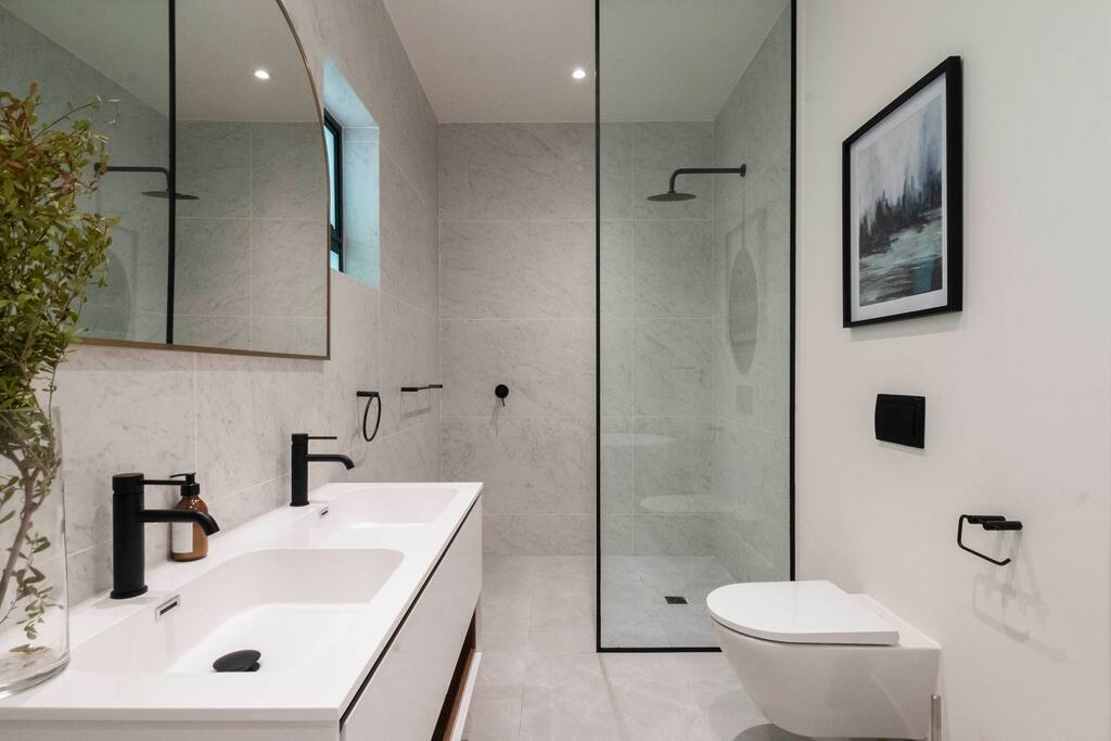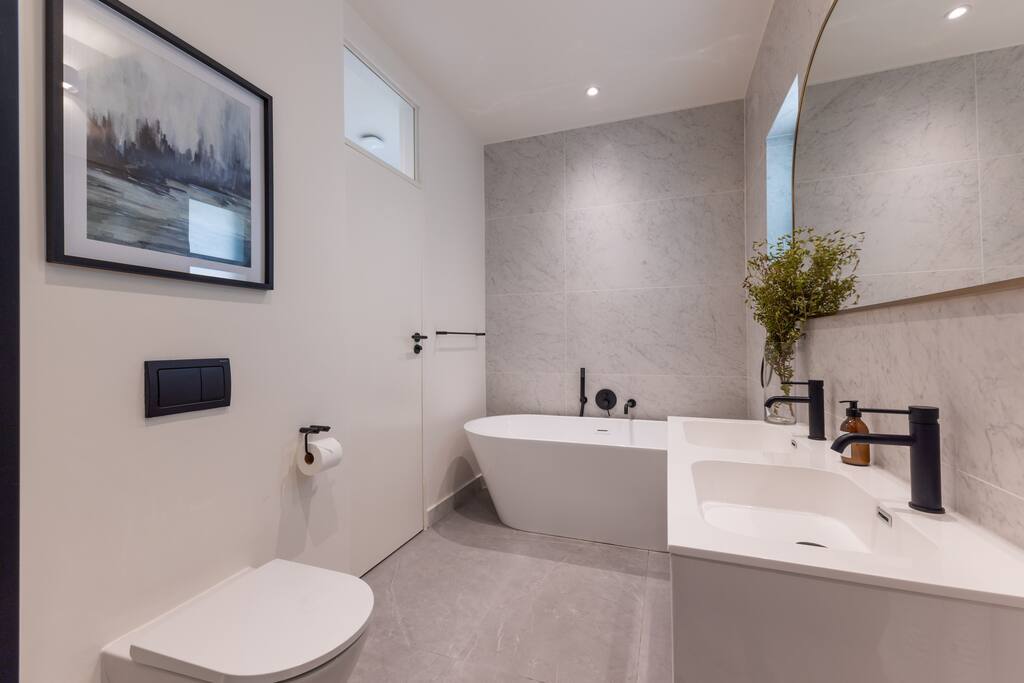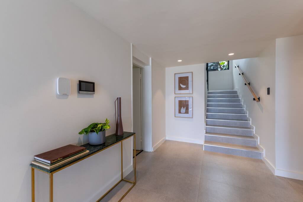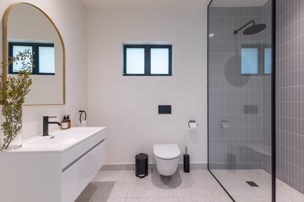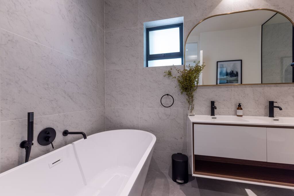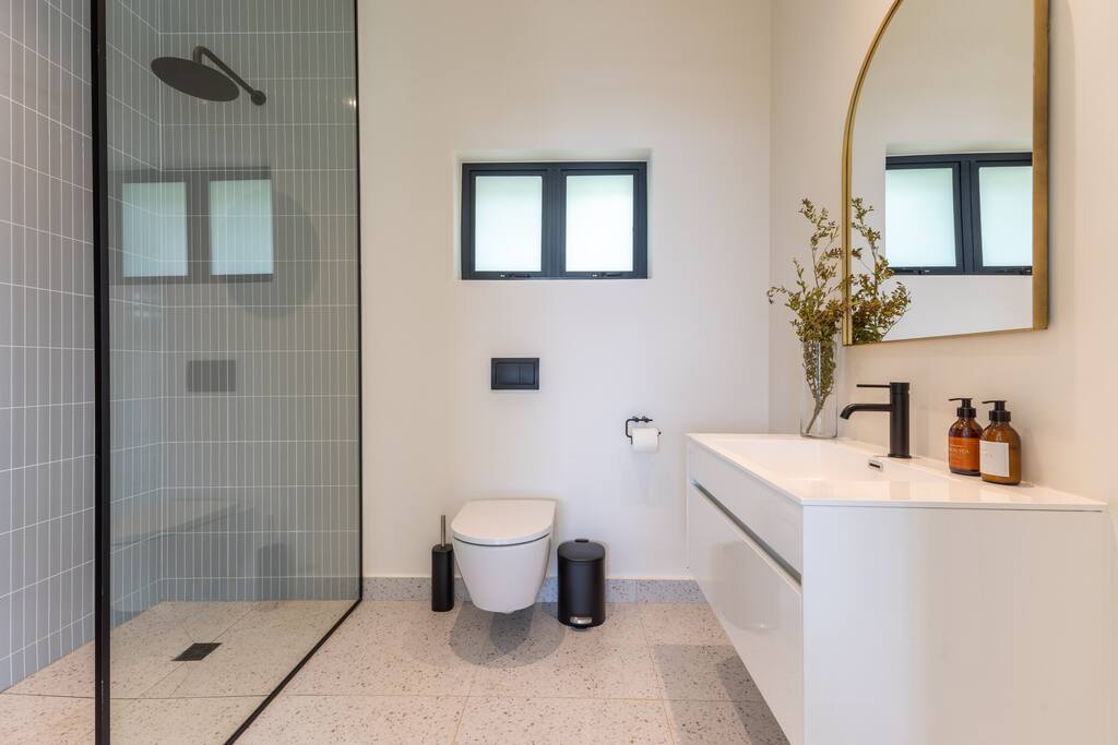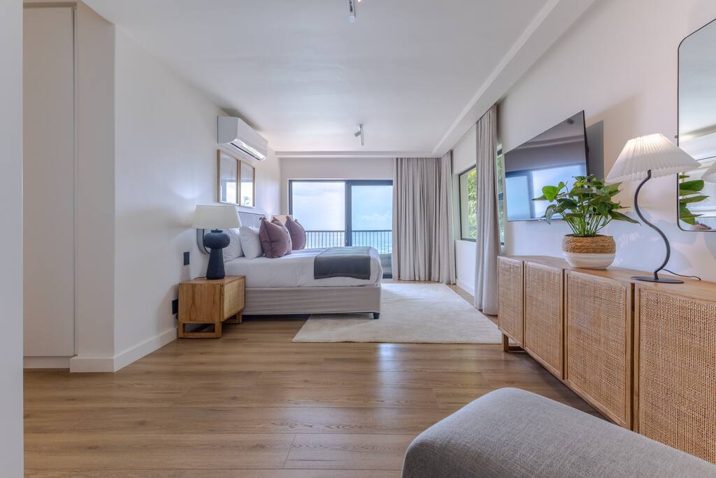 Located upstairs, this spacious bedroom features a king-size bed, balcony, and a luxurious en-suite bathroom with a shower, bath and double vanity. Enjoy panoramic sea and mountain views from every angle.
