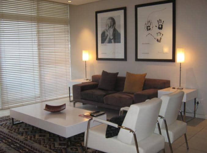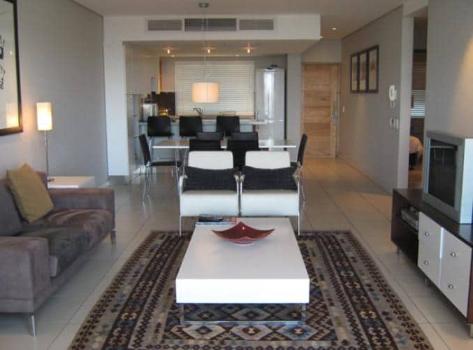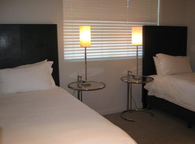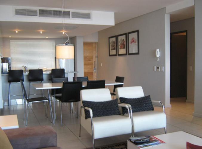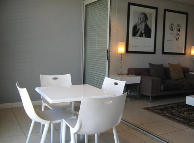 Exclusive, serviced apartment conveniently situated in close proximity to the Cape Town International Convention Centre as well as the V&A Waterfront. The apartment is elegantly furnished in a modern contemporary style. The apartment is fully equipped, air- conditioned and fitted with broadband Internet. There is a double bedroom with built in cupboards and en suite bathroom fitted with a bath and separate shower, a twin bedroom with en suite bathroom with a bath and separate shower, a guest toilet, fully fitted kitchen leading into open plan lounge / dining room. The apartment has a balcony that has great views over Cape Town.