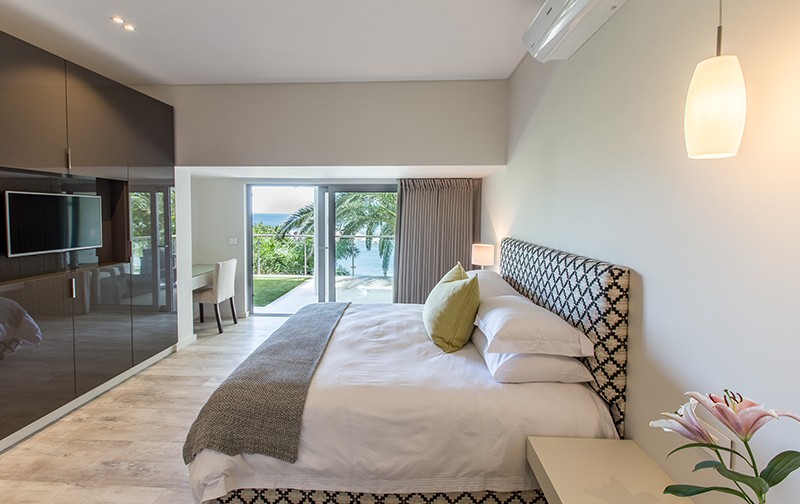 The main bedroom offers a king size bed, walk-in dressing room, full bathroom with bidet, desk, air con and elevated views of Bali Bay, the ocean and Twelve Apostles mountain range from its floor to ceiling windows.
