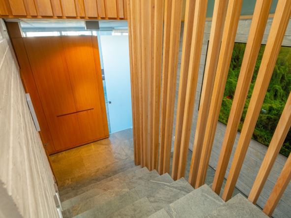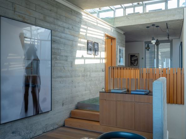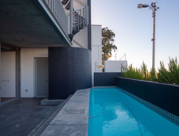The living and kitchen area which is on the road level is open plan leading onto a lap pool with exquisite views of the ocean and city. There is a large study on this level at the back of the house