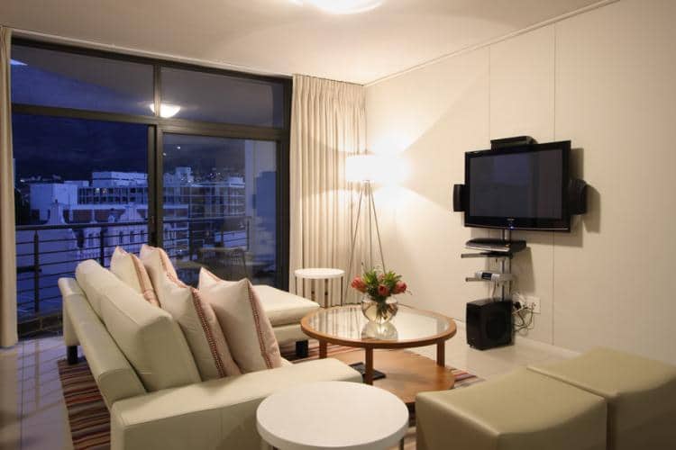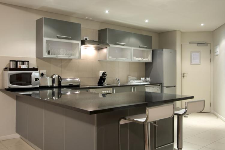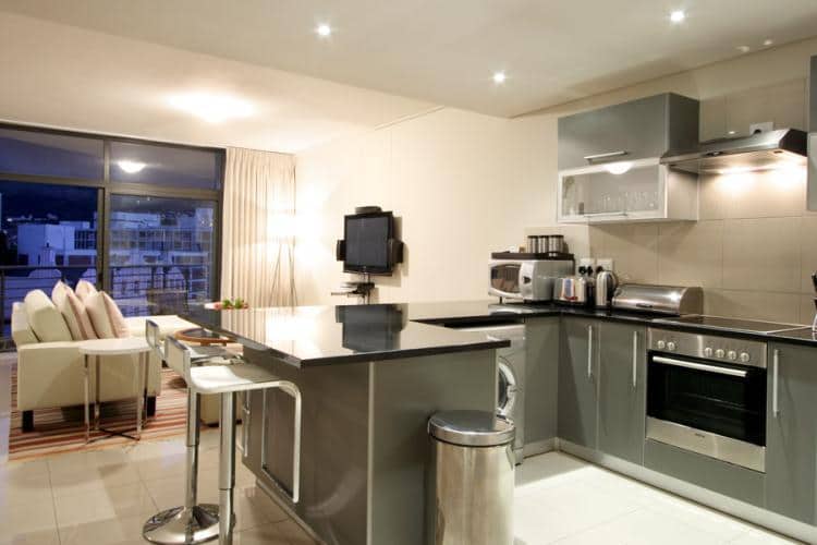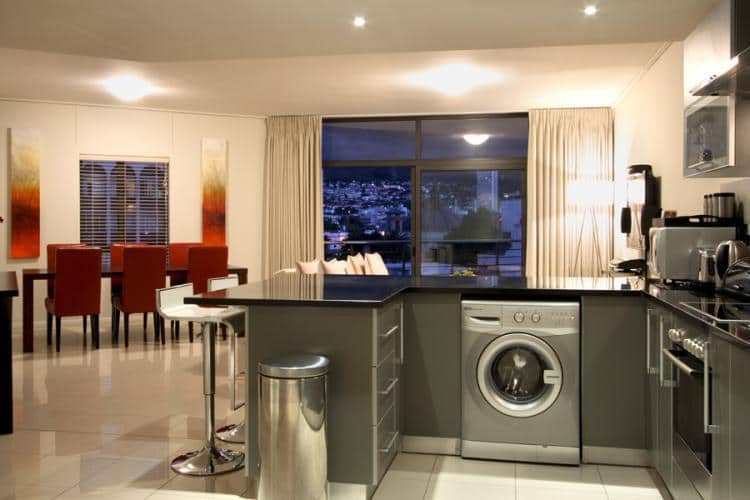 The luxurious lounge has breathtaking views of Table Mountain and is equipped with a LCD television, satellite TV and DVD player and under floor heating. Experience the magic of Cape Town from your private balcony. The lounge, dining area and kitchen are open plan. The dining room table seats six guests. The kitchen is modern and fully equipped with the following: washing machine, tumble dryer, fridge, microwave, crockery and cutlery.