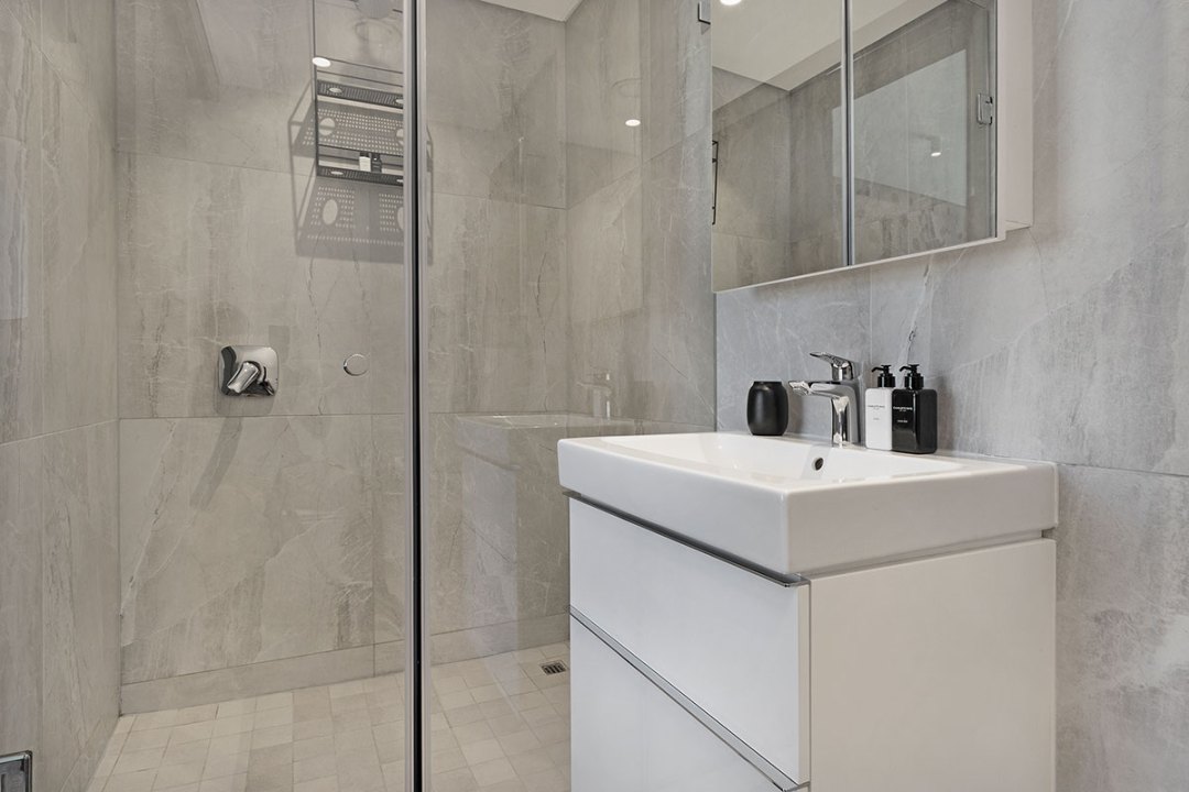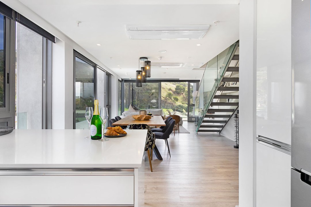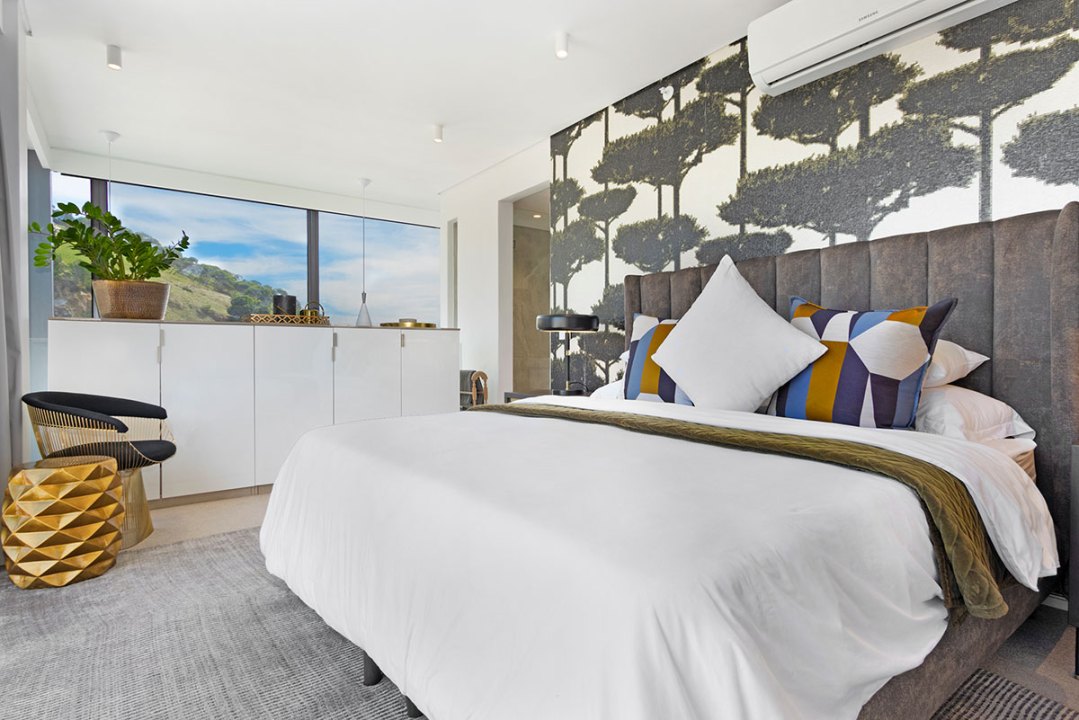 This newly built, light-filled retreat features floor-to-ceiling windows that provide breathtaking views of both the sparkling sea and the cityscape.