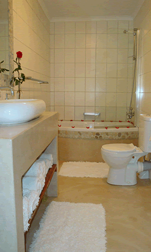This spacious elegant honeymoon (double) room, decorated with peaceful inviting cream roses, has beautiful