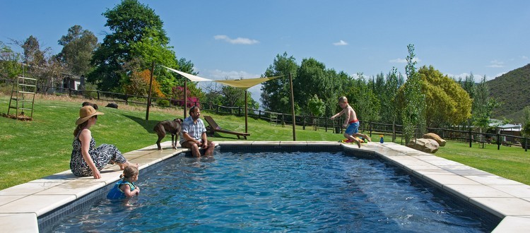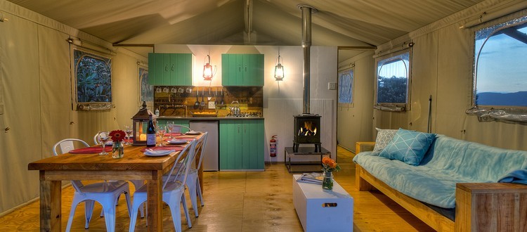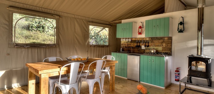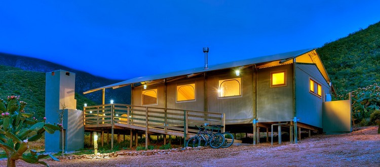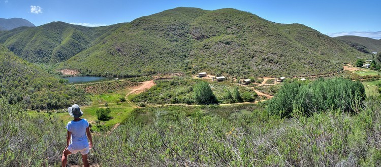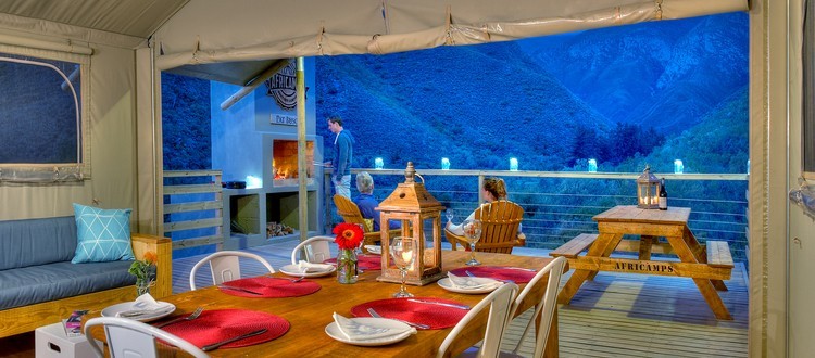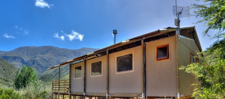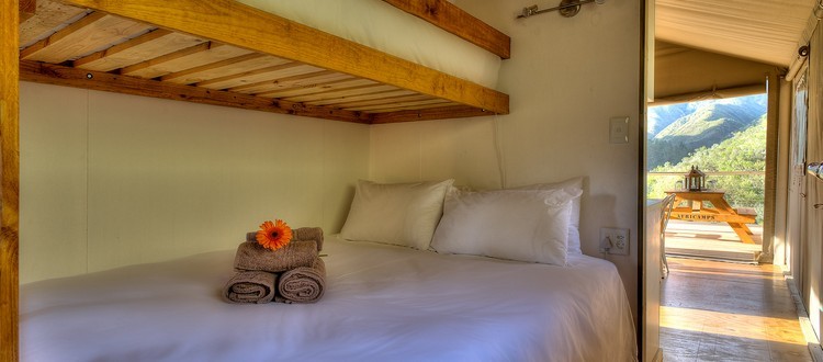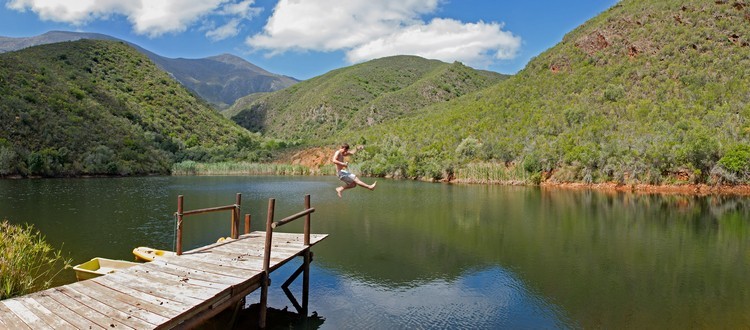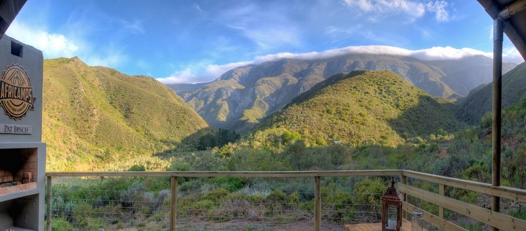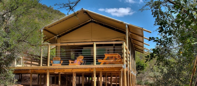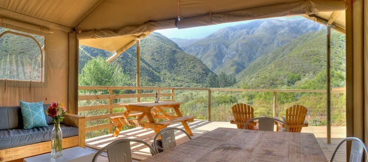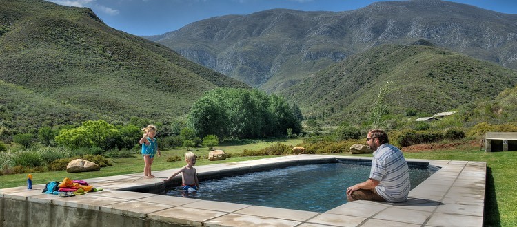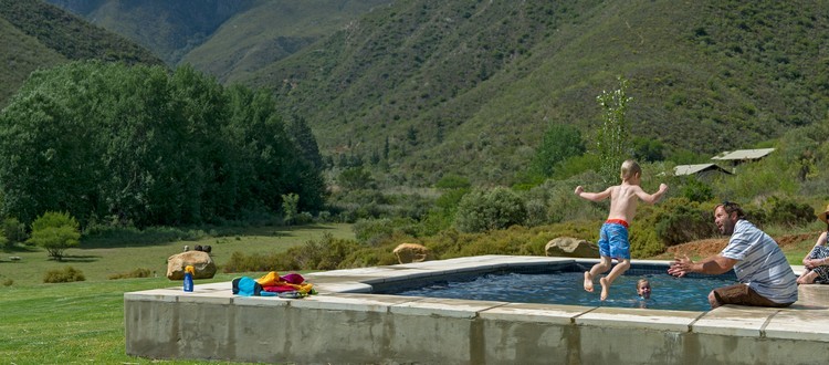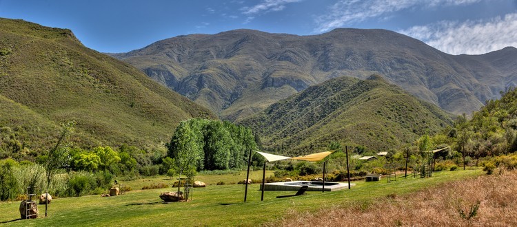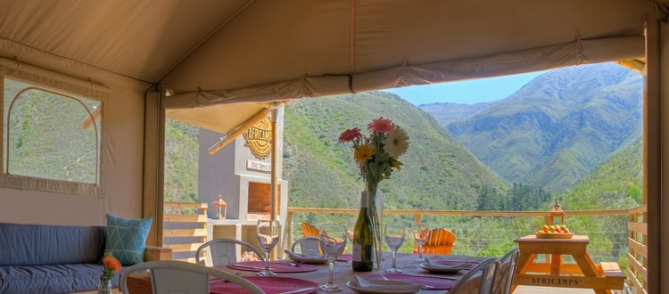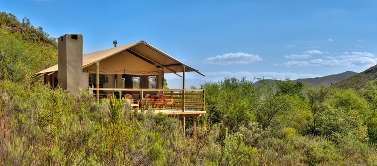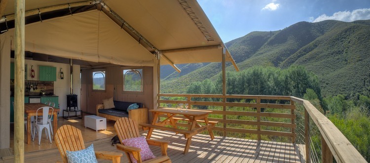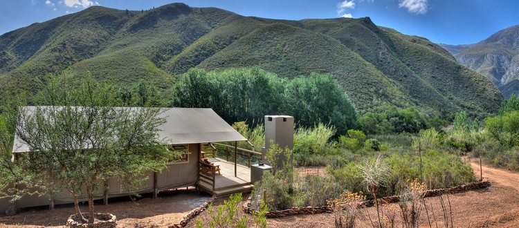 Attention all nature lovers: This AfriCamps location is situated in Pat Busch Mountain Reserve. 2000 Hectares of spectacular mountain fynbos with streams, mountain dams, birdlife and various animals such as bucks, fallow deer, Nguni cows and even a very shy leopard. The reserve is also home to a rare Protea Flower that was thought extinct for almost 50 years and is now under protection of Cape Nature. Our glamping tents are tucked away in the Cape fynbos and look out over a folded green valley with the Langeberg as a gorgeous backdrop. We invite you to escape the hustle and bustle and come and explore this hidden valley together with your dearest friends and family. The possibilities on the property are endless and include several walking trails, good bird watching, fishing for bass and swimming and paddling in the farm dam. The sparkling nine-meter swimming pool, fringed by a rolling green lawn is also a welcomed addition at which to chill in the summer blaze.