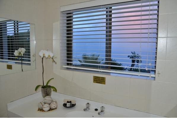 The Leopard room is on the ground floor with a sliding door overlooking the pool and the ocean. It has a double bed, a TV, a small lounge for two, a self-service kitchenette and an en suite bathroom with double basins, a shower and bath. It also has an air conditioner for the warmer summer days.