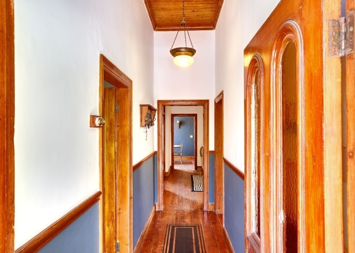 The cottage has wooden floors throughout and is beautifully furnished with a sense of light and space throughout. The two bedrooms are either side of the hallway at the front of the cottage, overlooking the shaded porch and verdant garden. Both bedrooms have Queen size beds and one has a fireplace to make for cosy winter evenings. There is one bathroom and it has both a shower and bath.