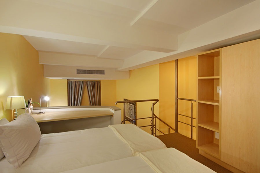 Above is the mezzanine loft-level bedroom with a king-size bed, which can be made up as two single beds. The bathroom has a shower and bath. There’s free Wifi, international TV channels and private parking.