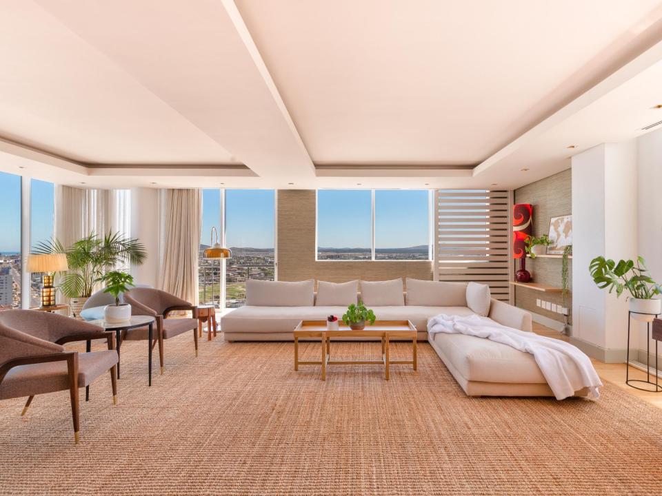 The apartment features a warm and intimate atmosphere, enhanced by natural light and thoughtfully designed interiors. The open-plan living space flows seamlessly onto a sunny private balcony, where guests can relax on luxurious loungers while taking in sweeping views of the ocean and city skyline.