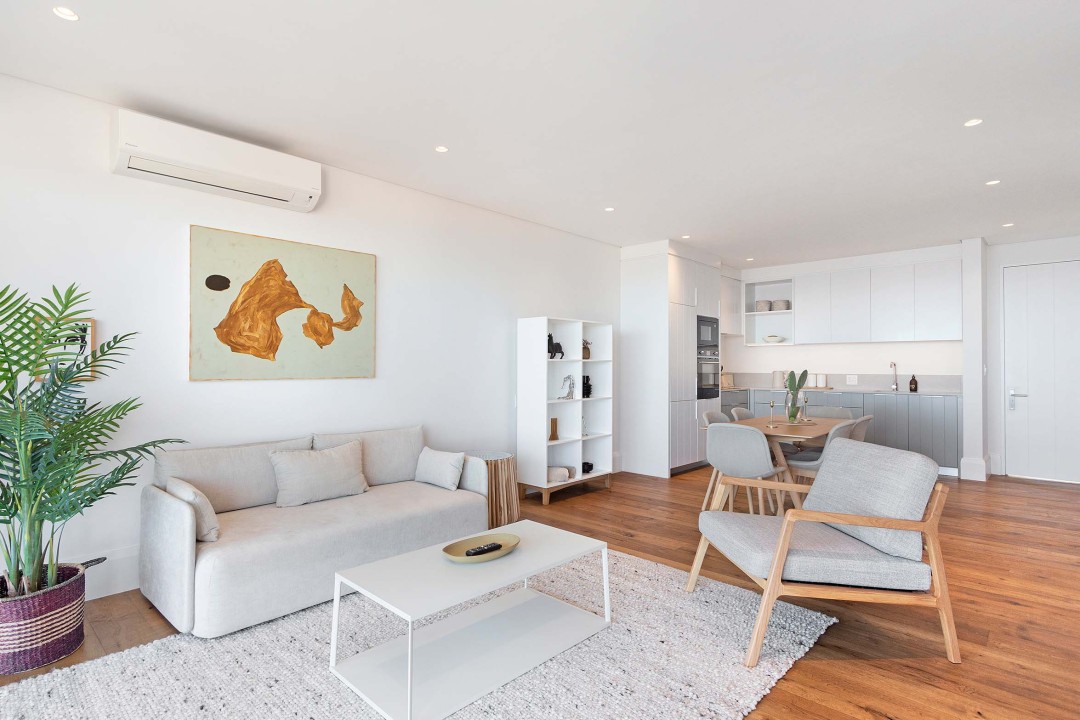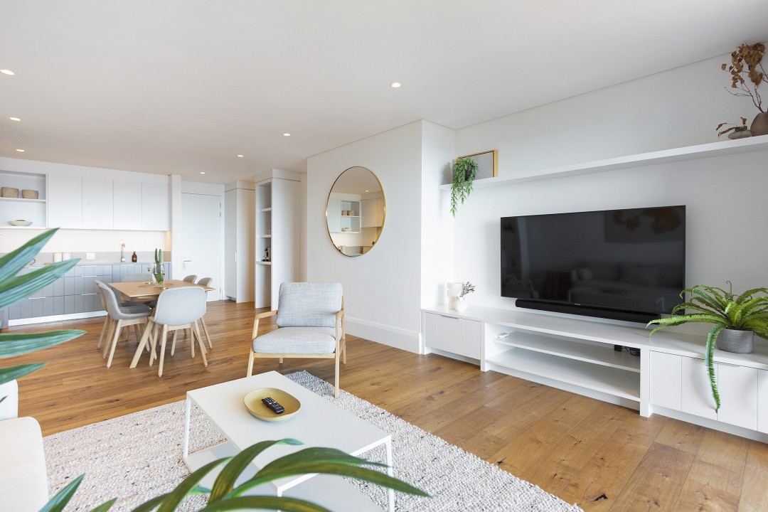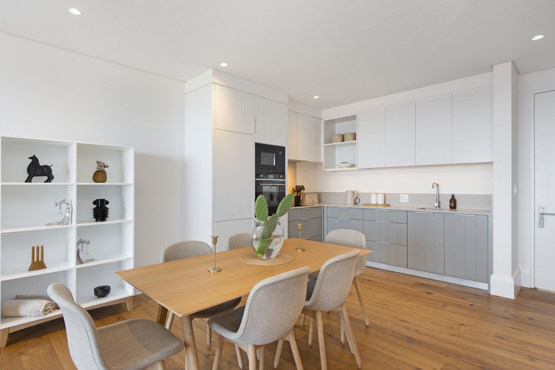 The open-plan living and dining areas flow seamlessly into a fully equipped kitchen featuring SMEG appliances and a Nespresso machine. Sliding doors from the lounge lead to a private balcony, perfect for morning coffees or sundowners while enjoying panoramic sea views.
