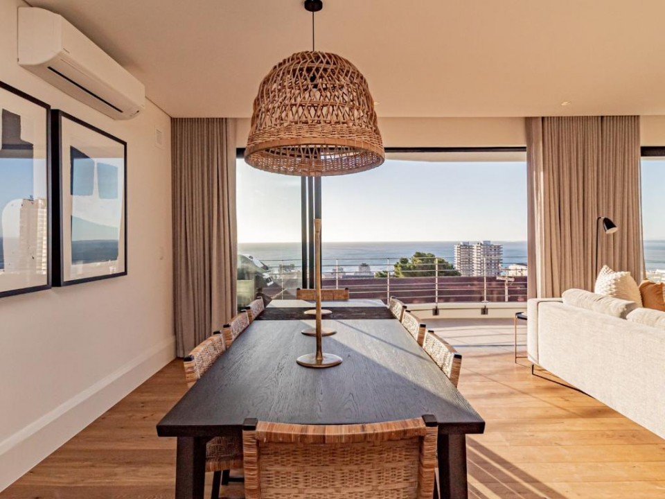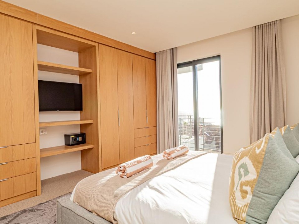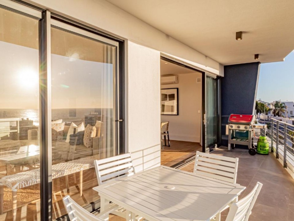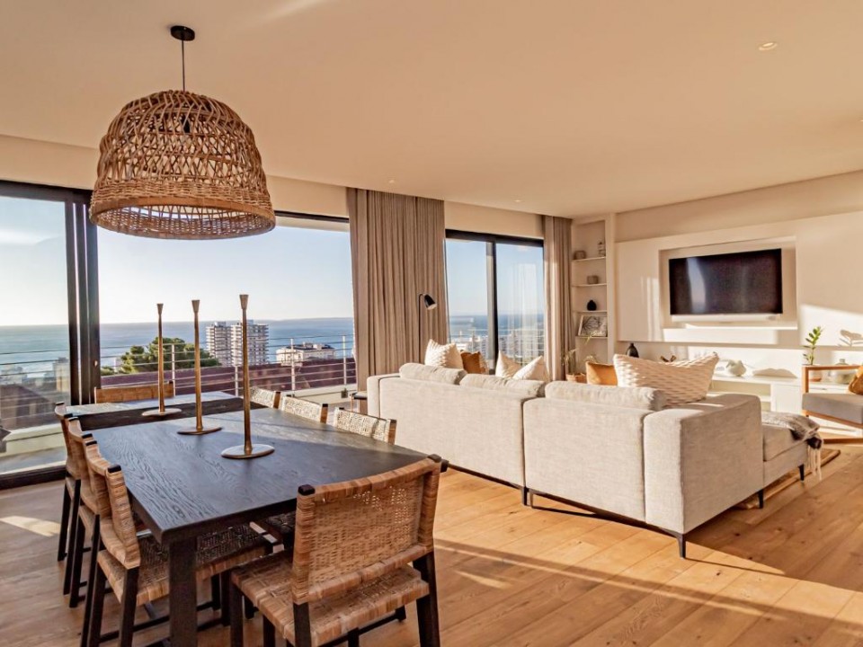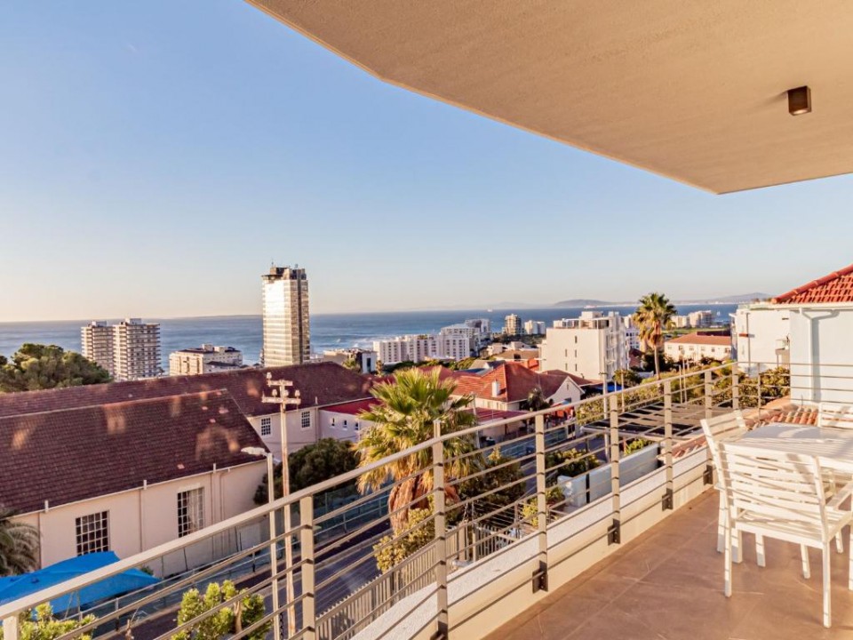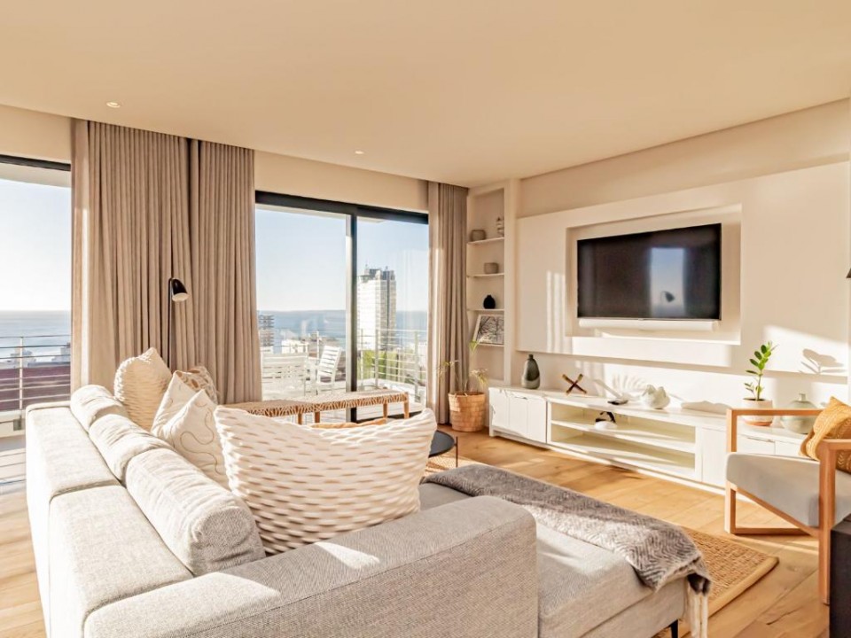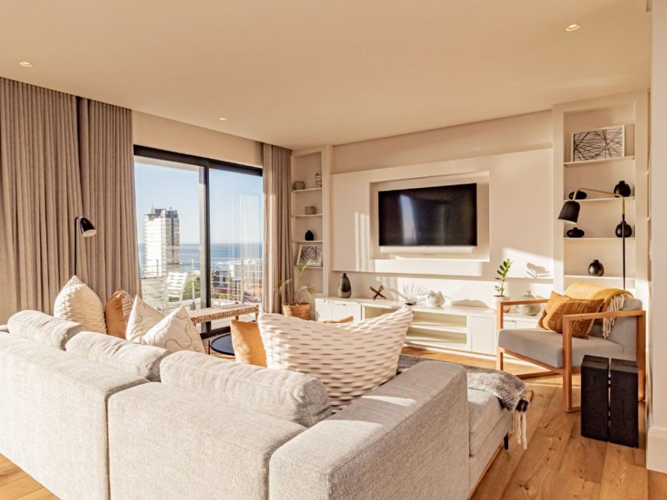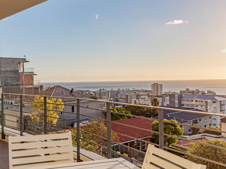 Situated in high up central Sea Point, this modern 2 bedroom, 2 bathroom apartment has a private balcony with uninterrupted sea views. The modern living and dining areas are open plan to the kitchen, which is fully equipped with SMEG appliances and a Nespresso machine. The private balcony, which is accessed from the lounge via sliding doors has seating for 4 and a gas BBQ to enjoy the sunsets. Down a short corridor, past a laptop-friendly work station, are the 2 bedrooms and 2 bathrooms. The master has a juliette balcony, with lovely sea views and a full open plan bathroom. The second bedroom also has a juliette balcony with looks towards the mountain, with a side view of Lion’s Head. The second bathroom is separate and doubles up as a guest loo. On the fourth floor of the block, there is a communal outdoor swimming pool and entertainment area open for guests to enjoy. There is secure parking available inside the apartment block, along with lift access to the apartment.
